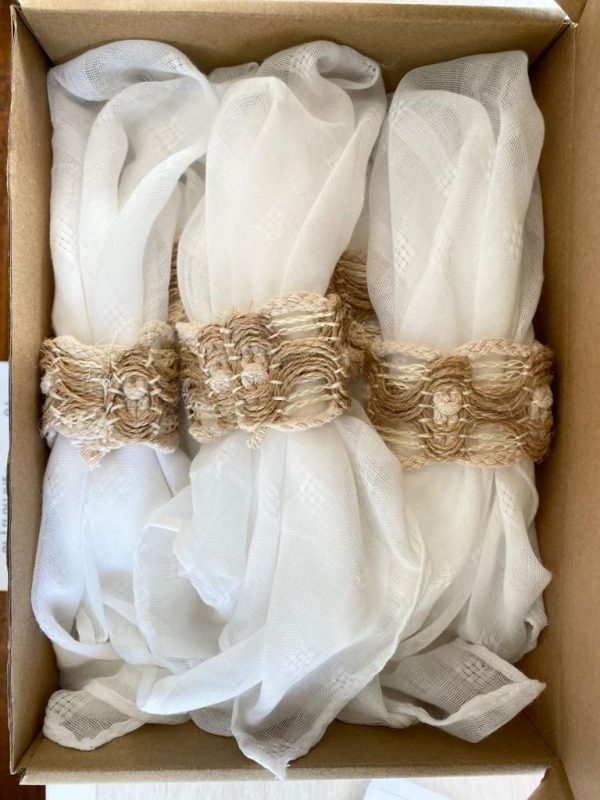 מארז 12 מפיות בד לבנות מיוחדות עם טקסטורה עדינה ונעימה + חבקים מעוצבים בצבע טבעי