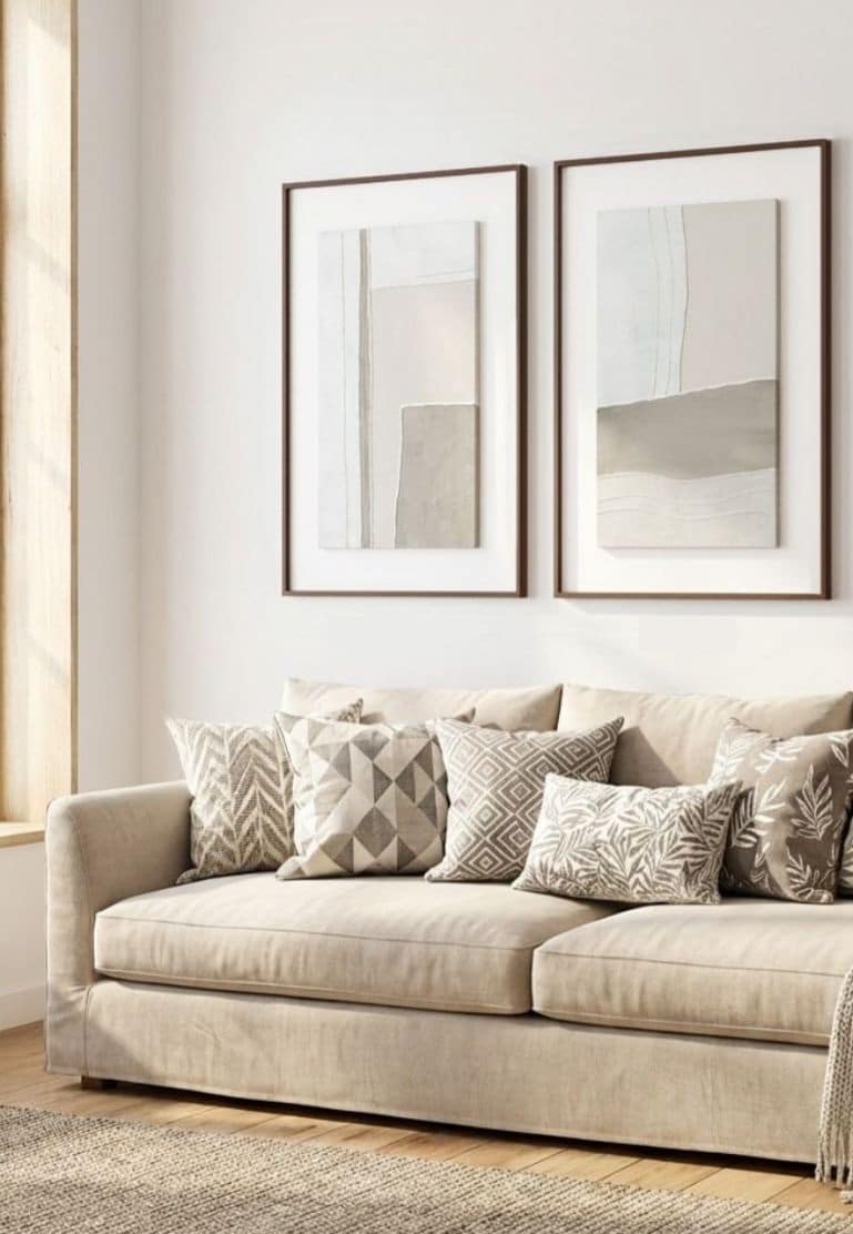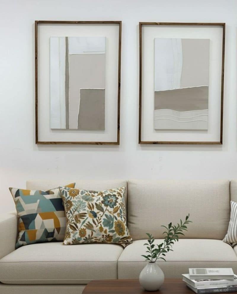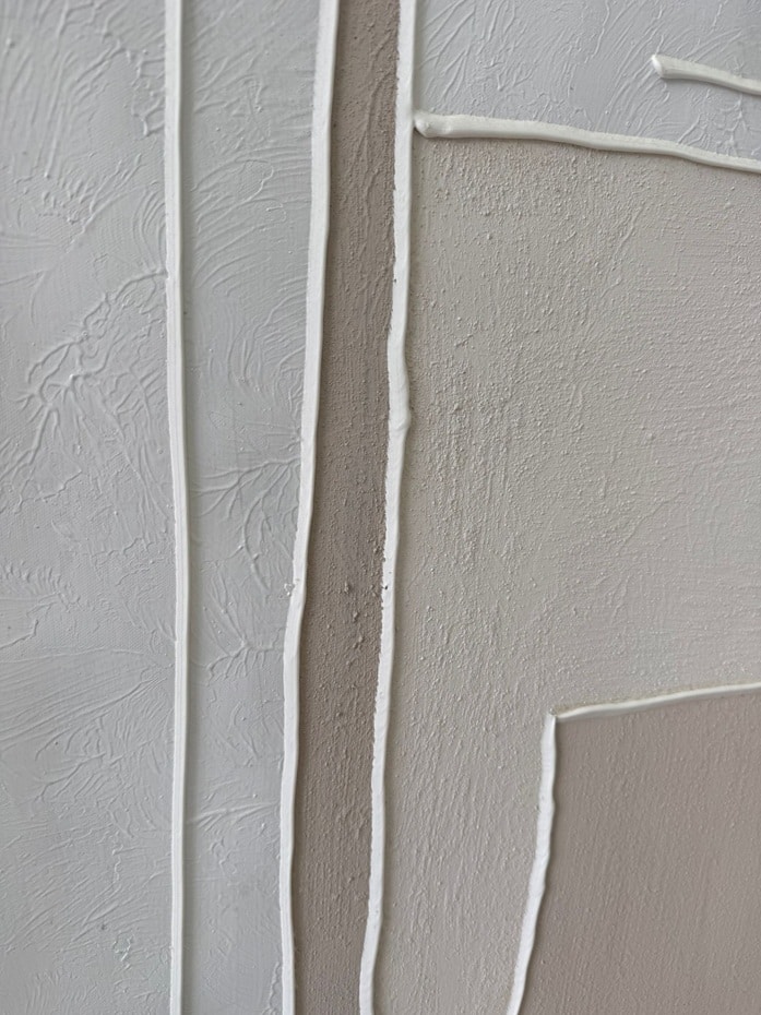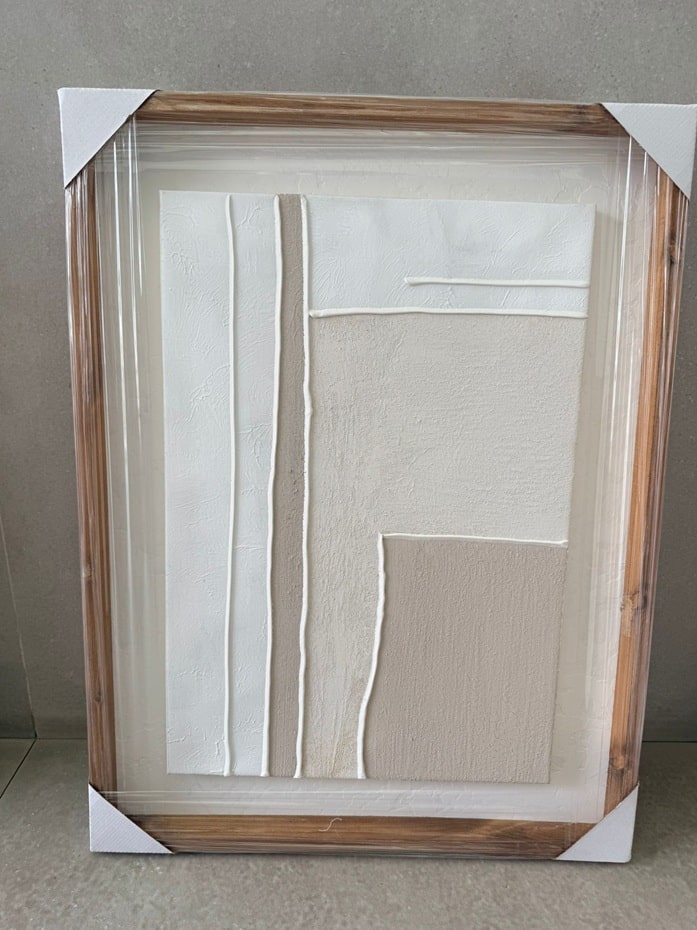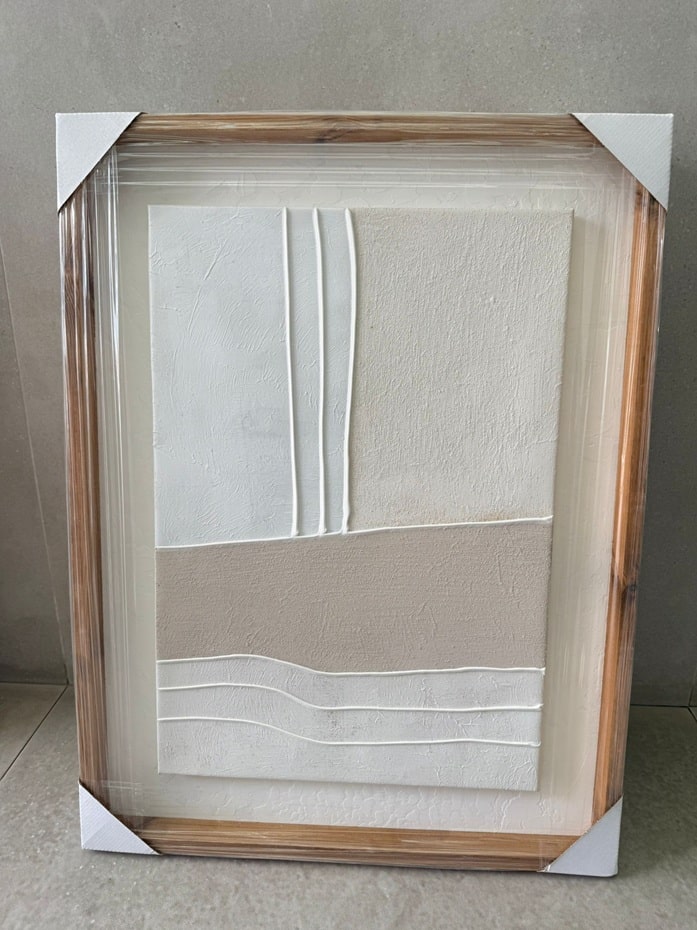 תמונת קנבס מהממת עם צורות מופשטות בגדלים שונים בגוונים לבן, שמנת ובז', עם מסגרת עץ