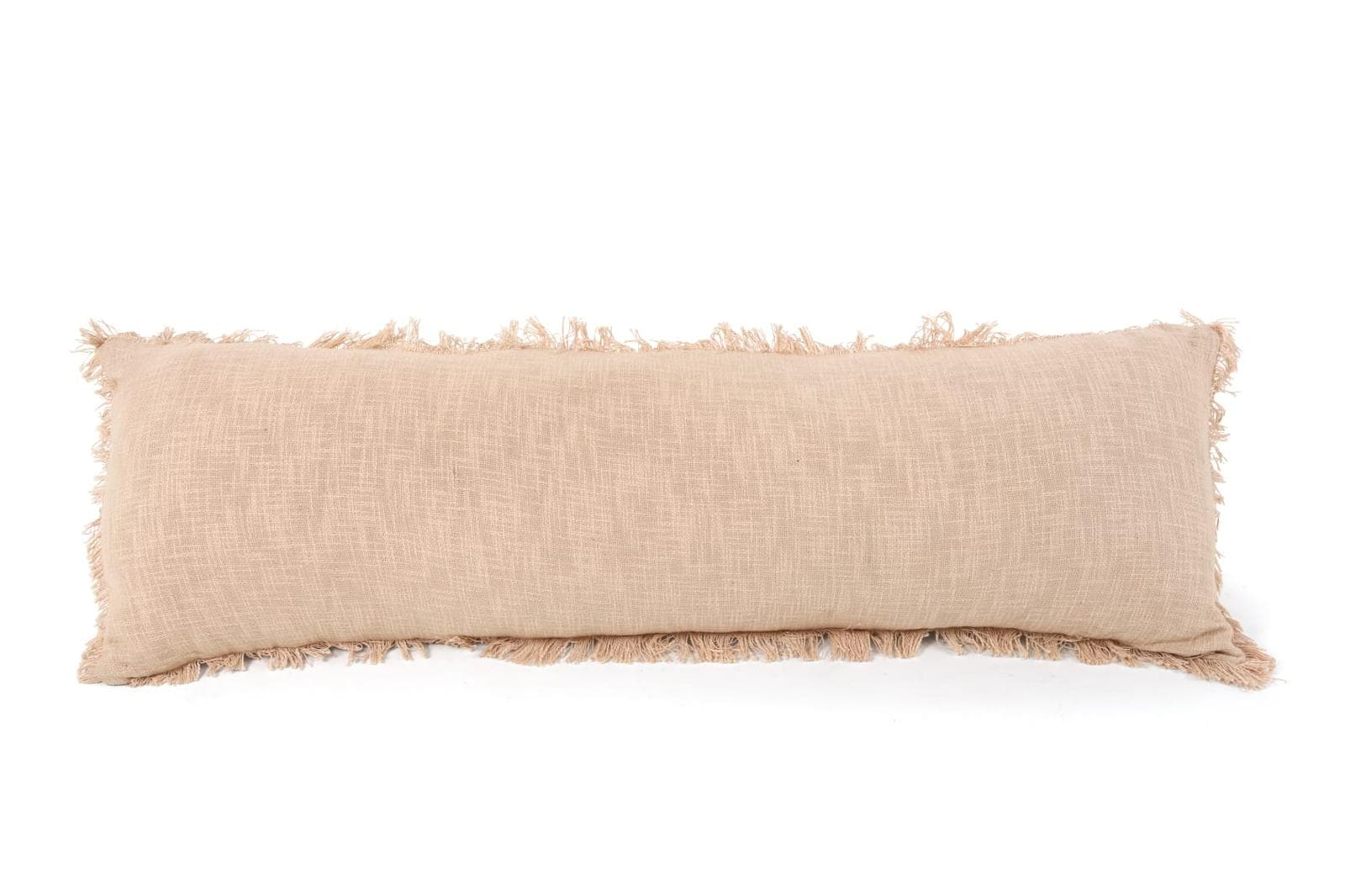 כרית מאורכת בצבע ורוד פודרה עם סיומת פרומה, כרית ארוכה למיטה זוגית