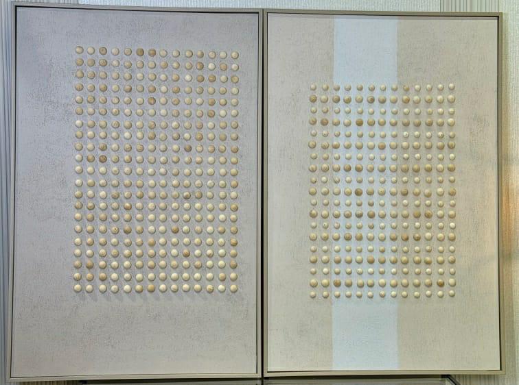 זוג תמונות קיר מהממות עם טקסטורה, תמונה אמנותית ומיוחדת בגוונים טבעיים בשילוב עיגולי עץ בולטים מסודרים בצורה מלבנית