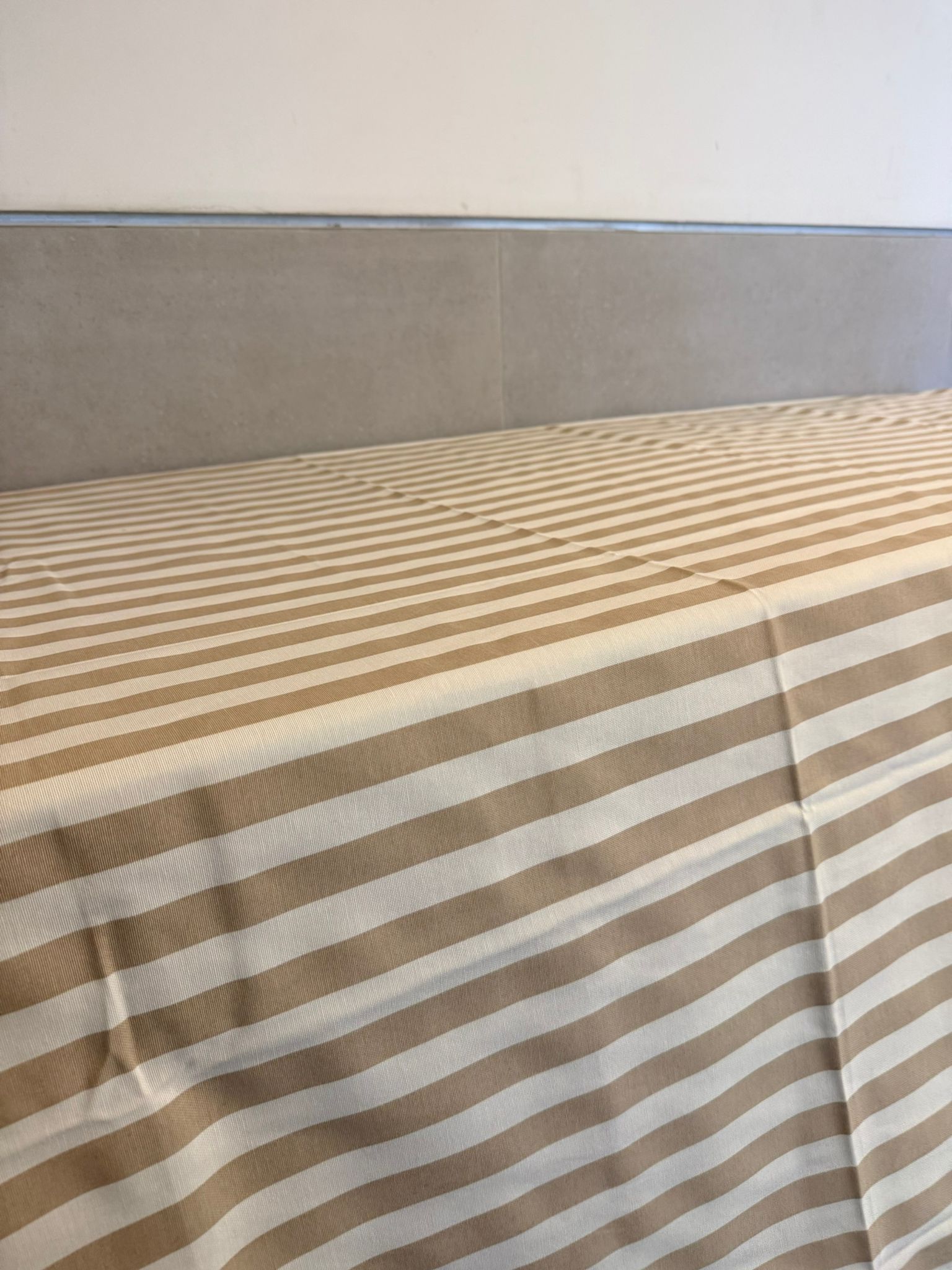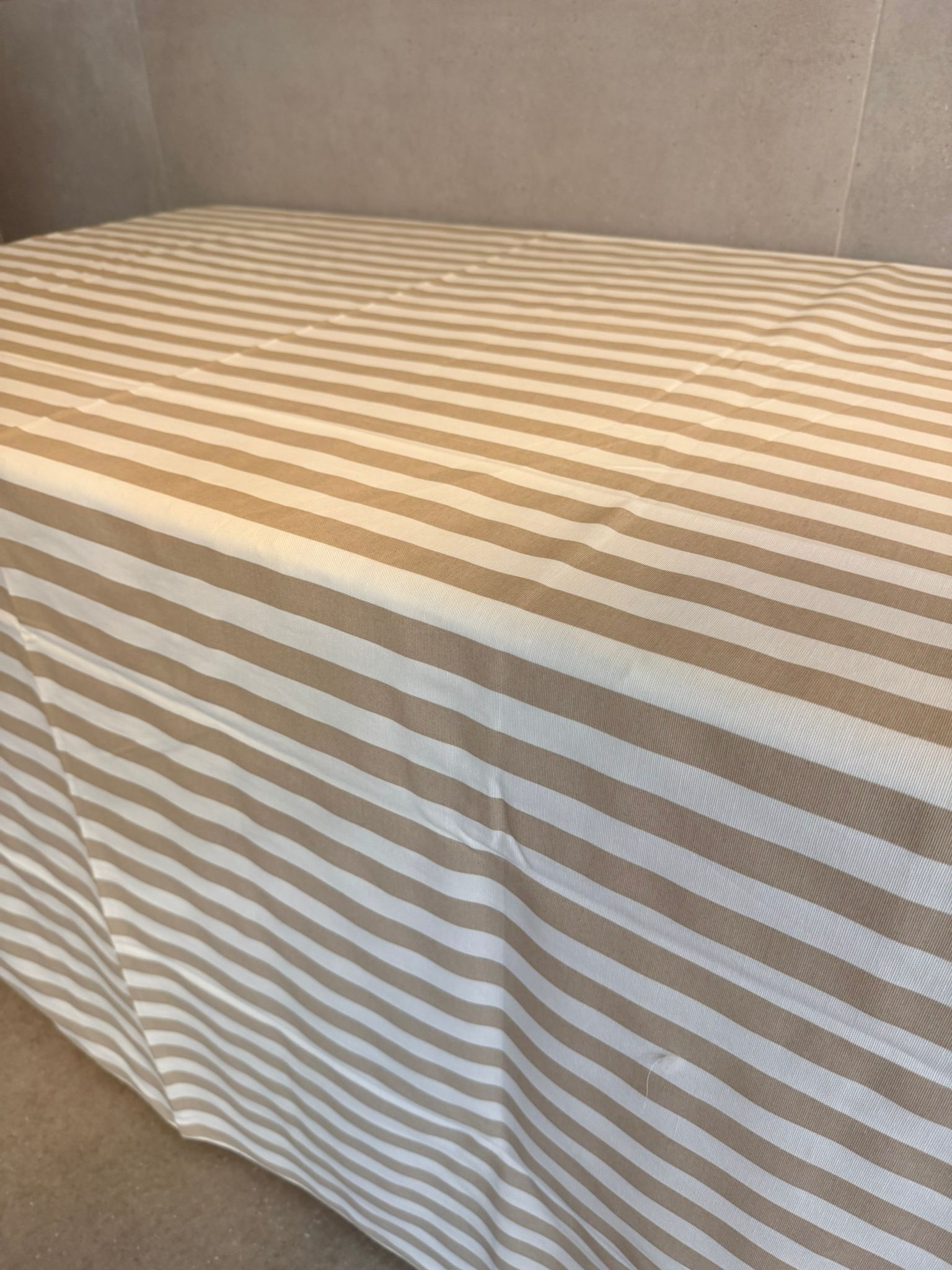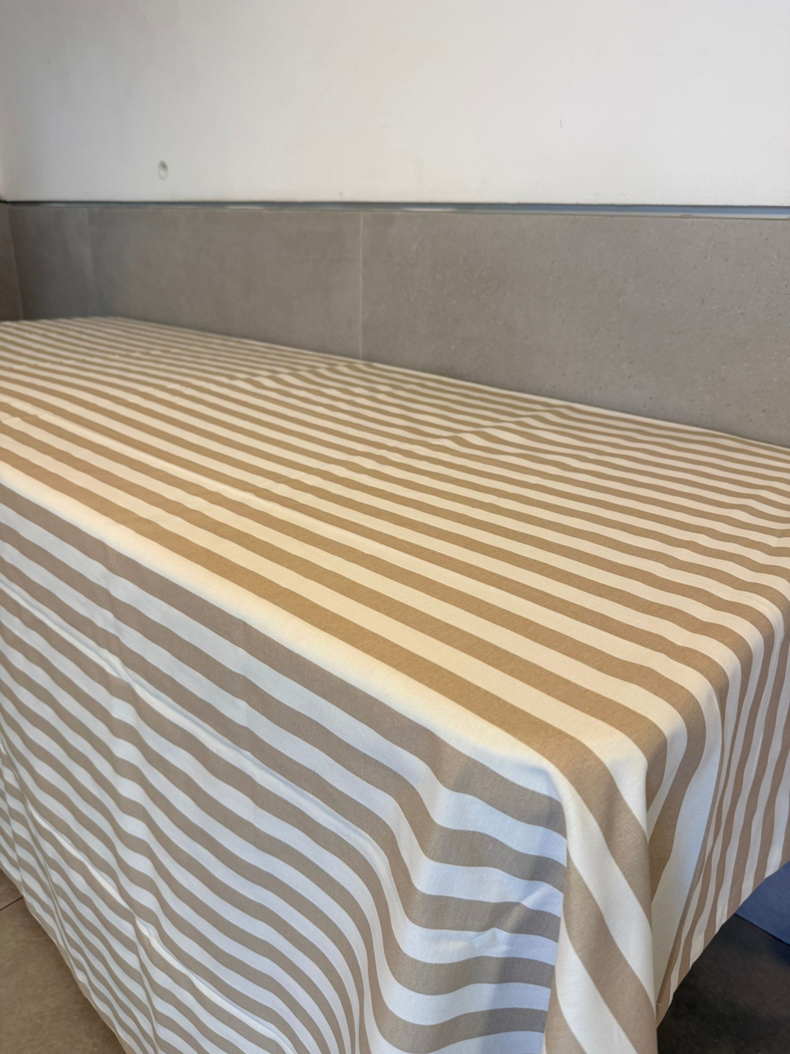 מפת שולחן חגיגית בעיצוב פסים, מפה לבנה מבד נעים ומיוחד עם הדפס פסים בצבע חום