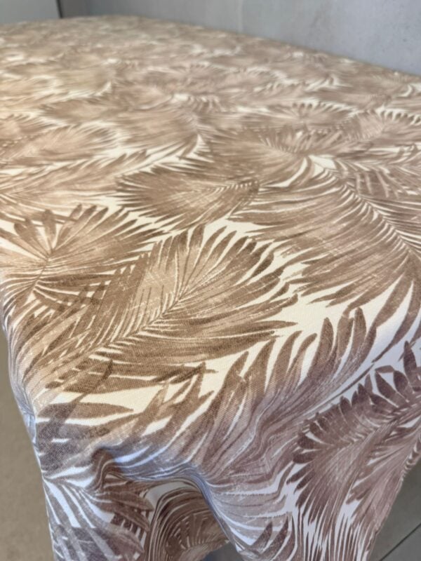 מפת שולחן חגיגית בעיצוב טרופי, מפה לבנה מבד נעים ומיוחד עם הדפס עלים עצי דקל בצבע חום