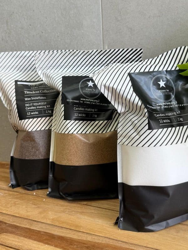 הערכה כוללת שקית ובתוכה 1 קילו של פתיתי שעווה (ללא ריח) ו12 פתילים