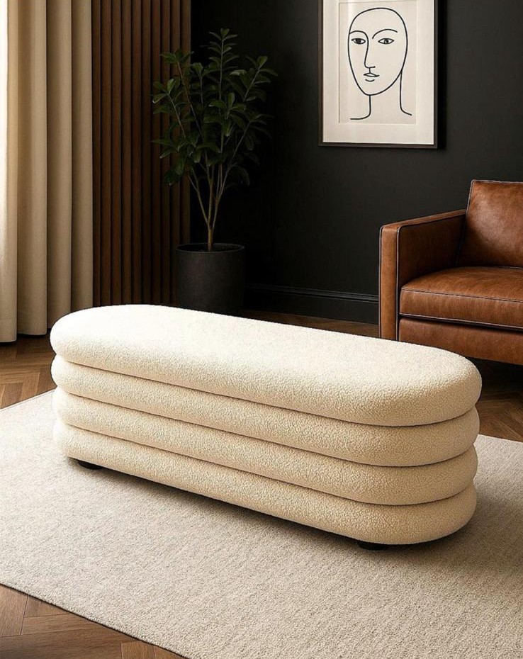 הדום נפתח מבד בוקלה בצבע שמנת, ספסל מרופד בצורת מלבן מעוגל