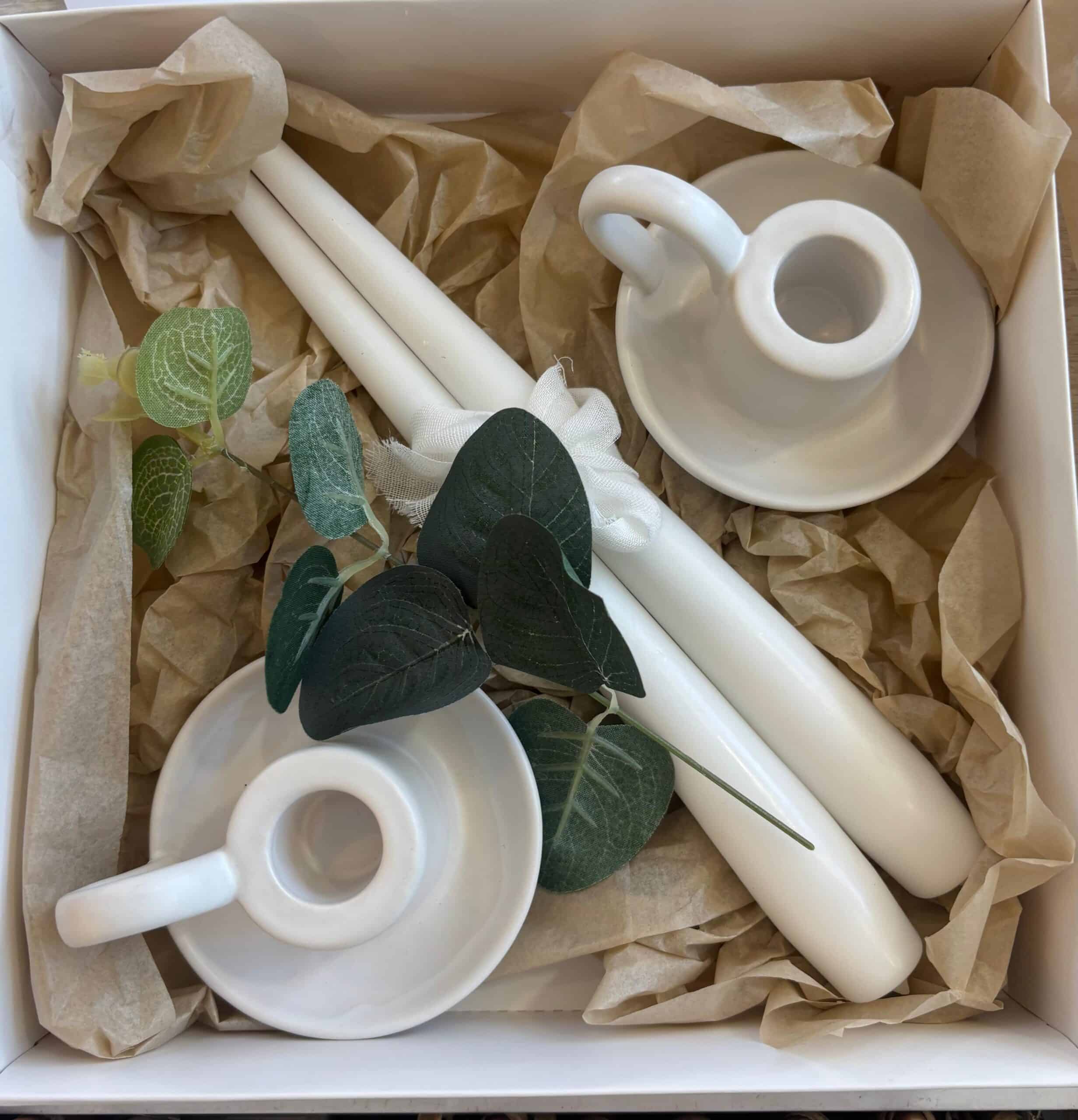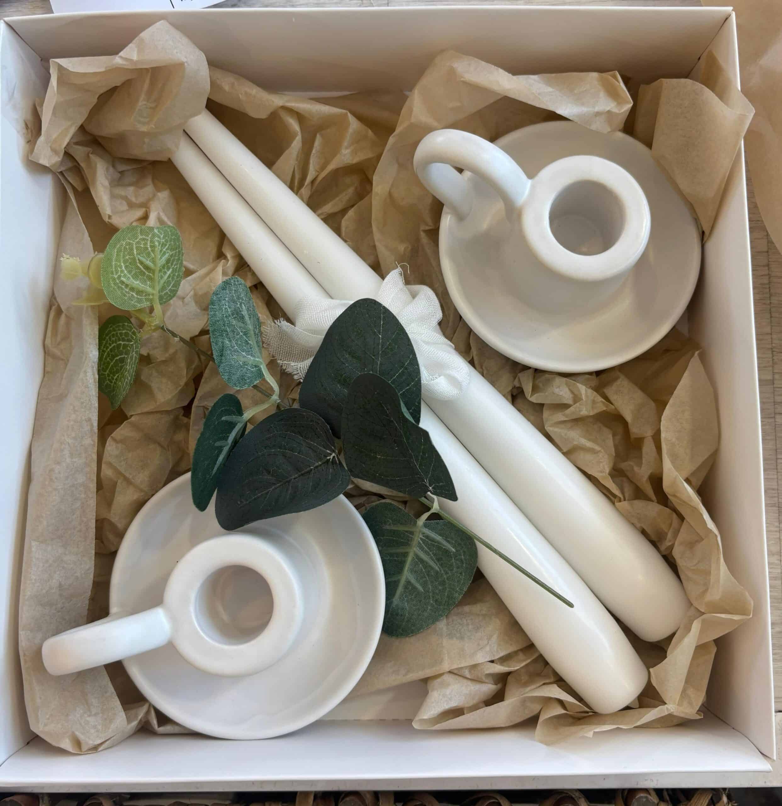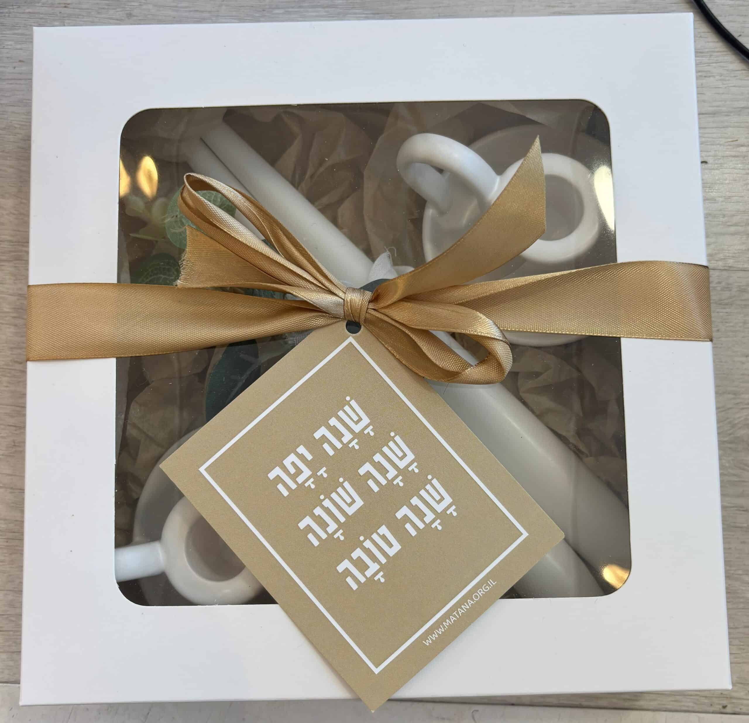 זוג פמוטים (סוג משתנה לפי מלאי), זוג נרות שבת (גווןמשתנה לפי מלאי) בקופסת מתנה