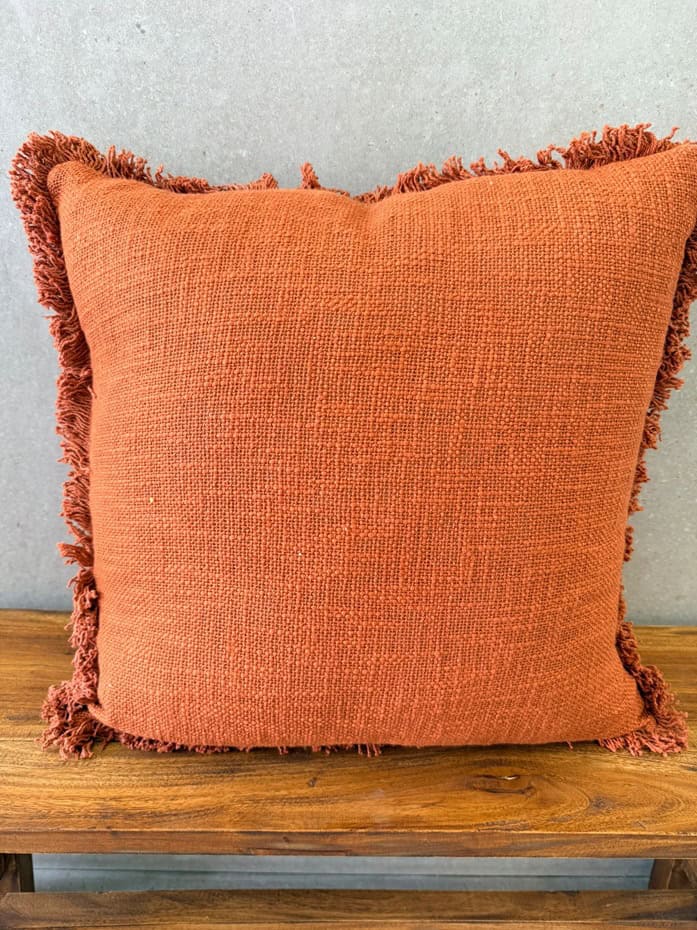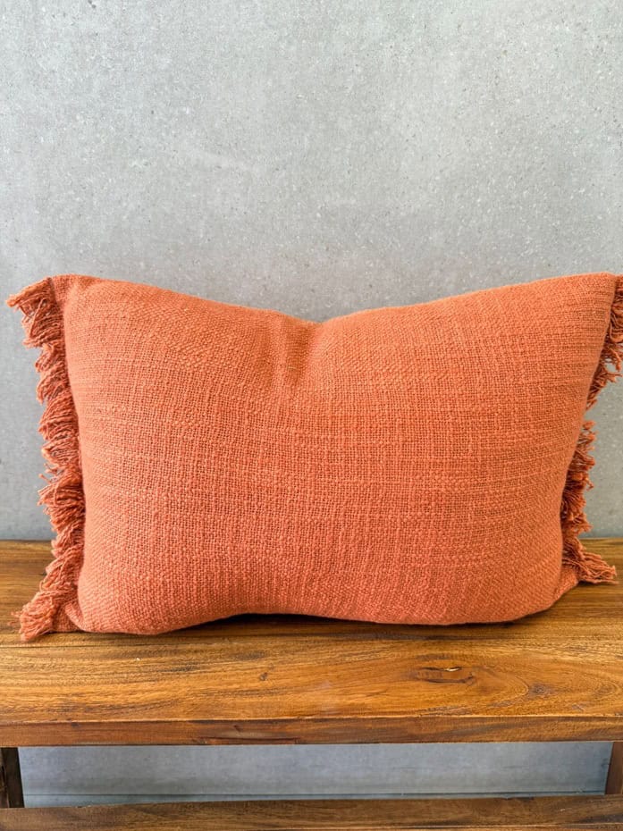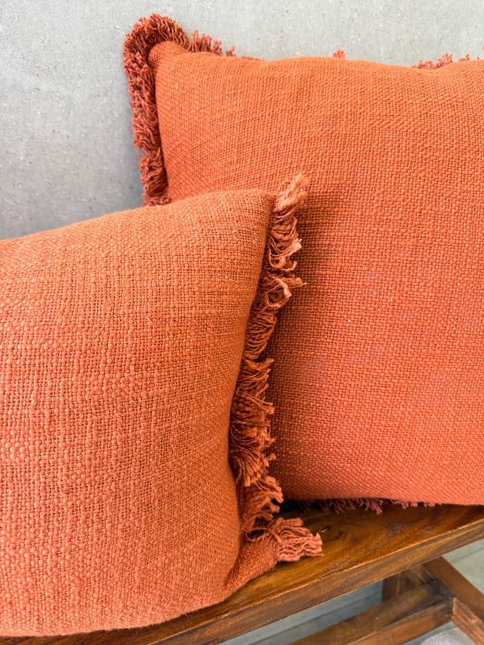 כרית מהממת בטקסטורה עשירה מבד איכותי ונעים עם פרנזים, מפנק ורך למגע, בגוון טרקוטה – חמרה, כתום חום אדמה
