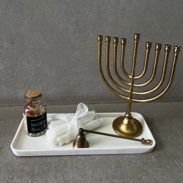 החנוכייה מגיעה יחד עם מגש בצבע לבן, בקבוק גפרורים דקורטיבי, פעמון – לכיבוי נר. 44 נרות בצבע לבן.