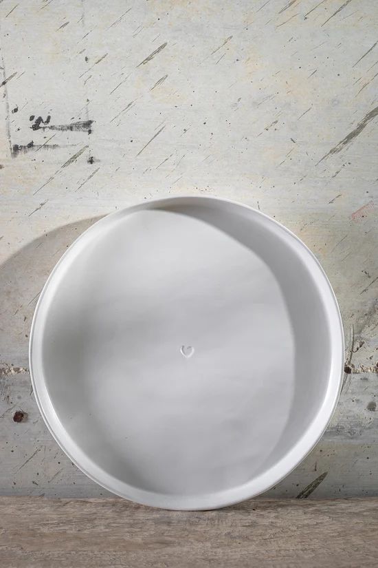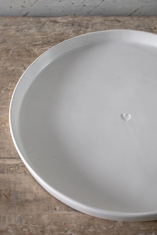 צלחת הגשה לבנה עגולה מקרמיקה בגימור מט, צלחת מהממת עם הטבעת לב קטנה ועדינה במרכז