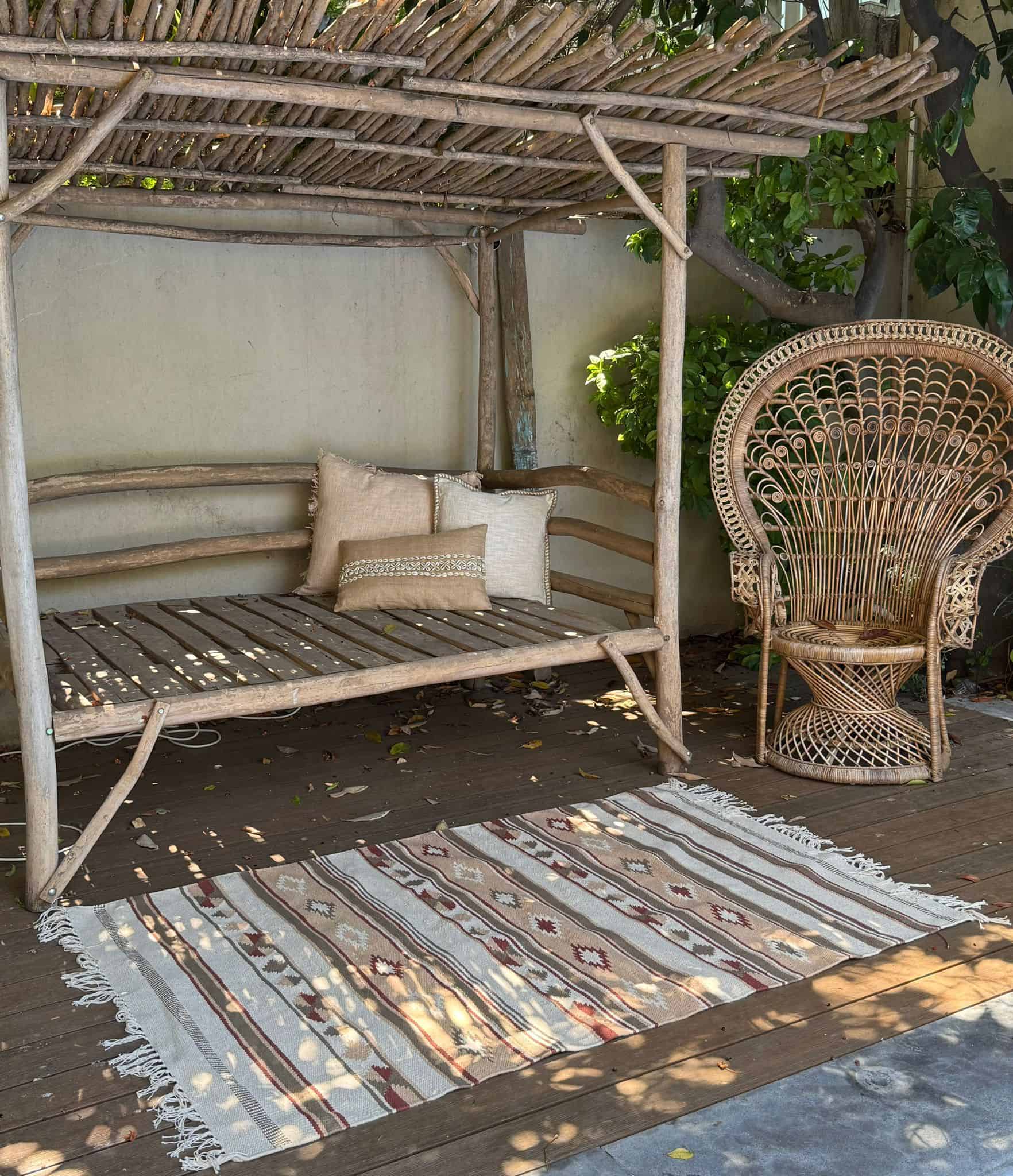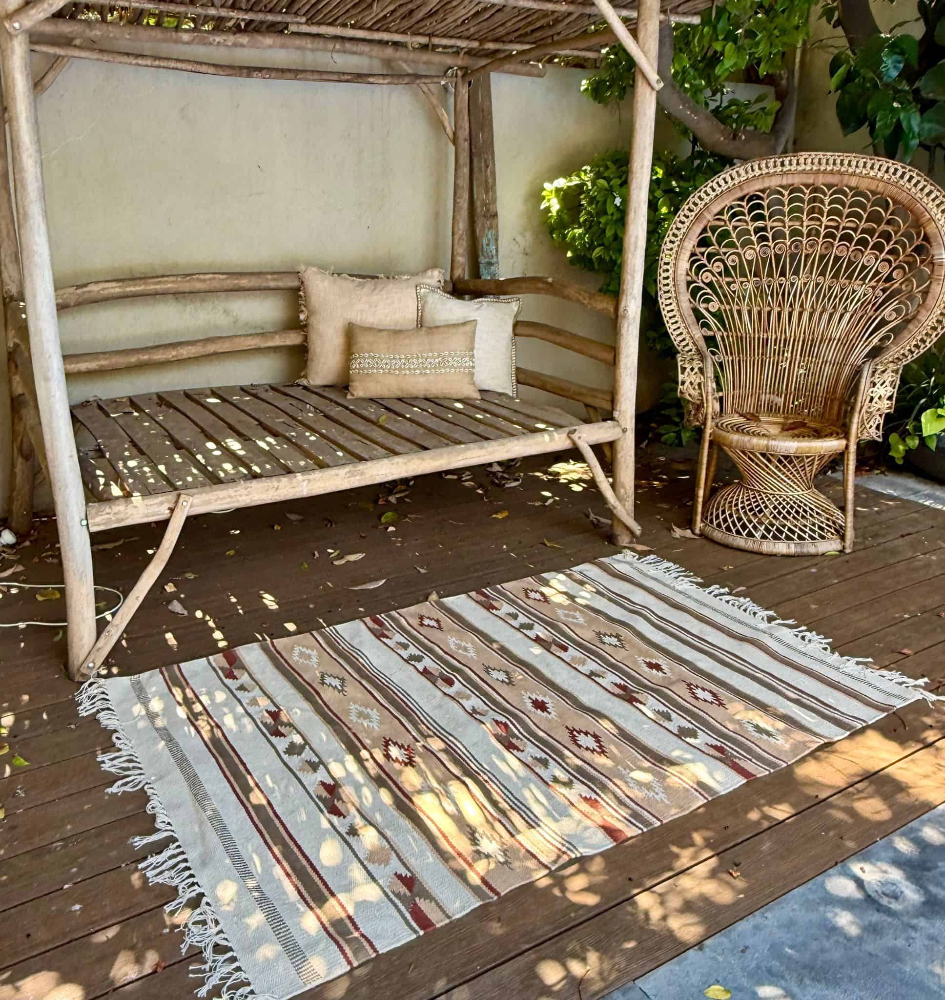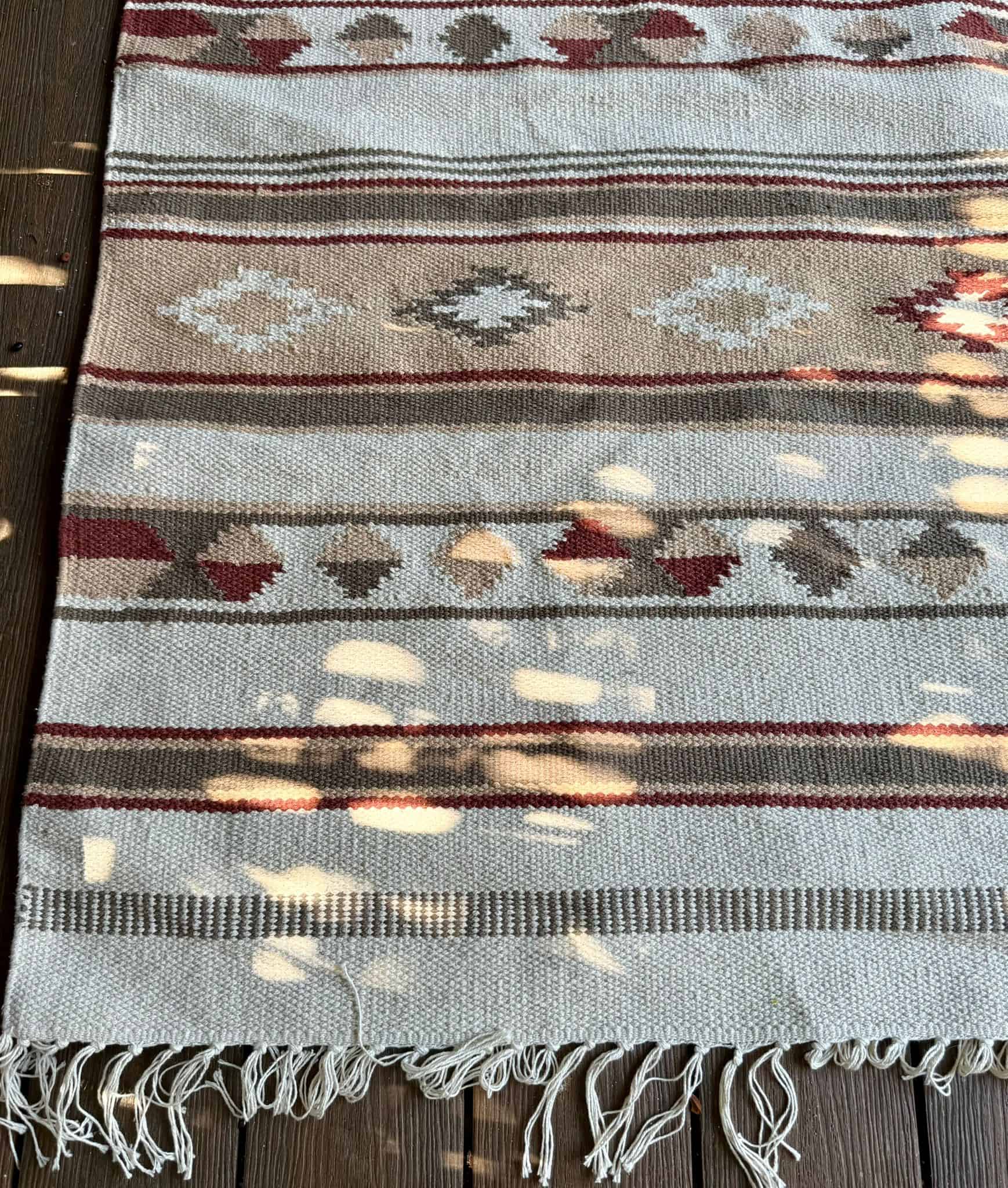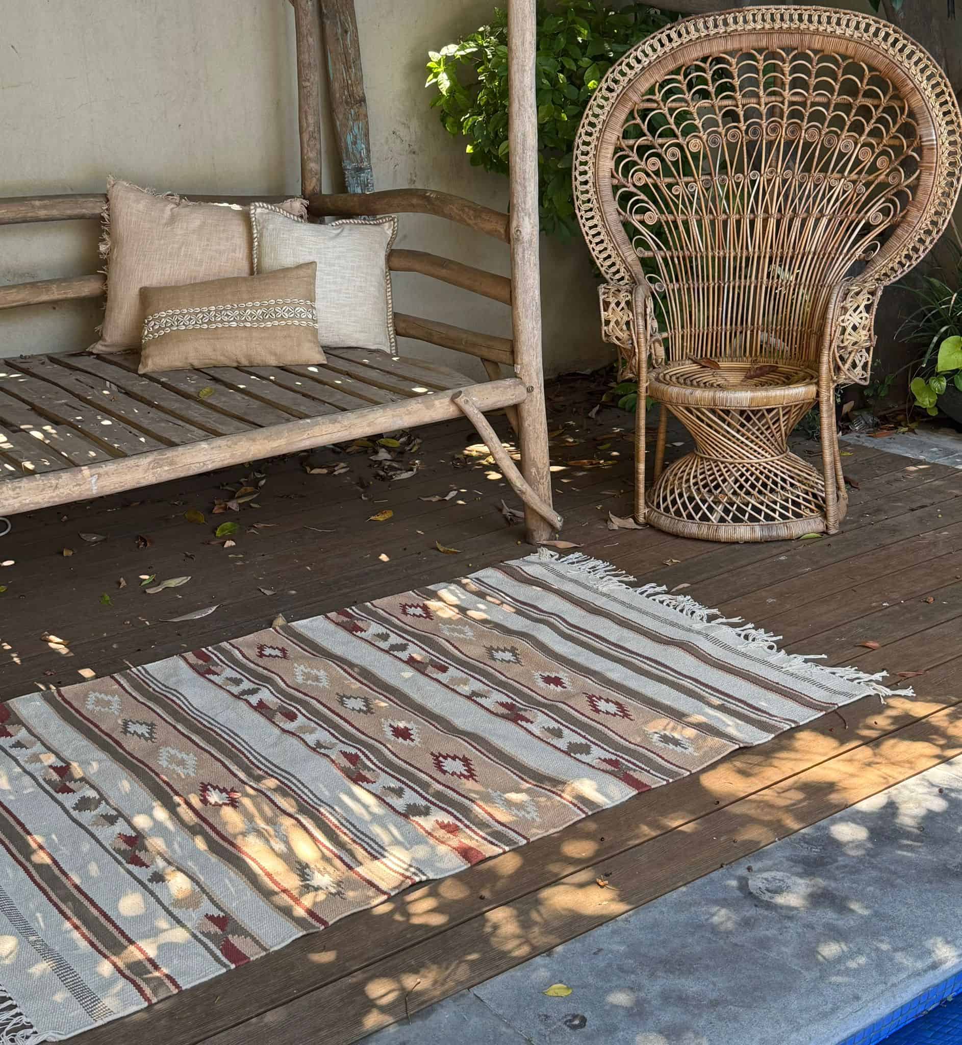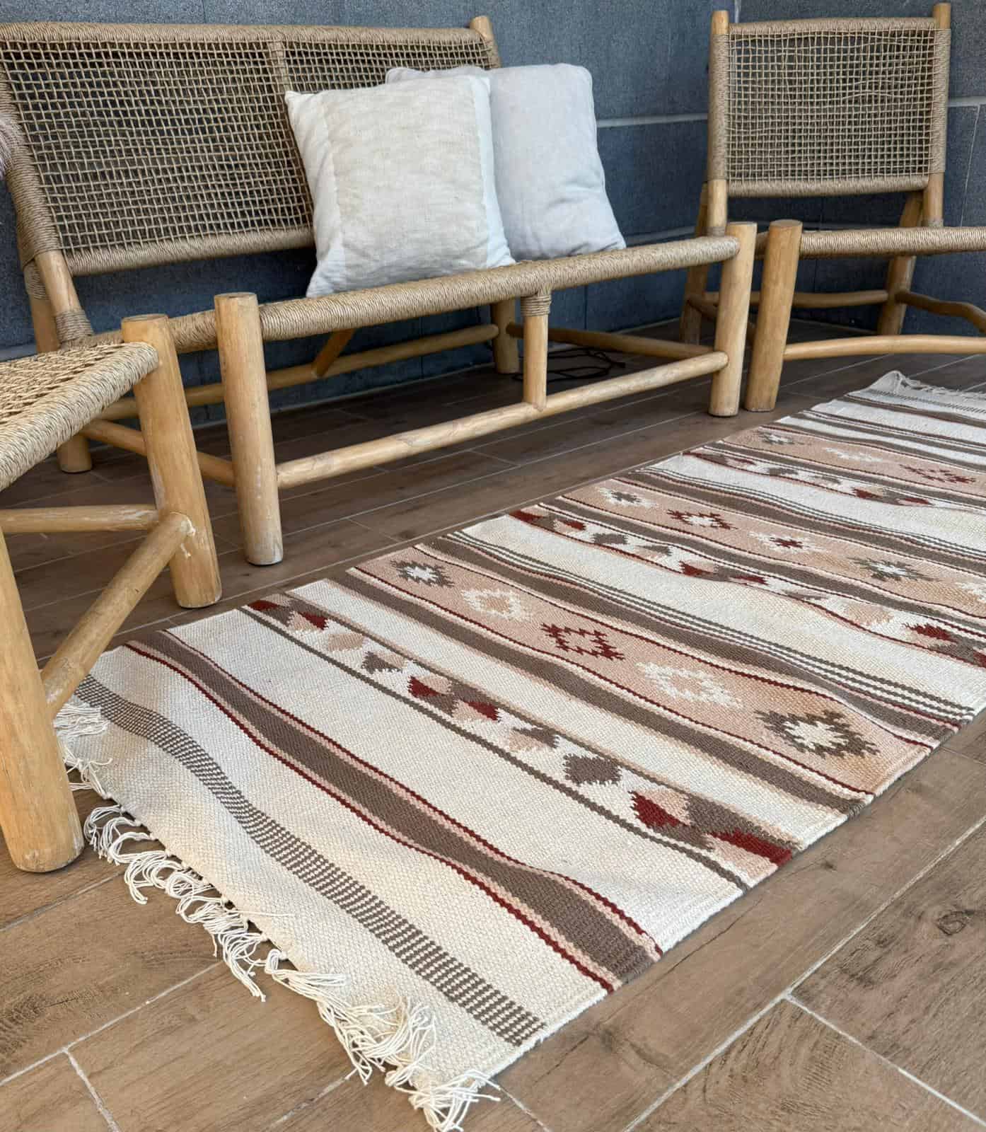 שטיח כותנה מעוצב בגוון טבעי עם דוגמאות בגווני חום בז' ובורדו, פרנזים בפאות.