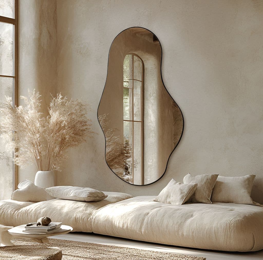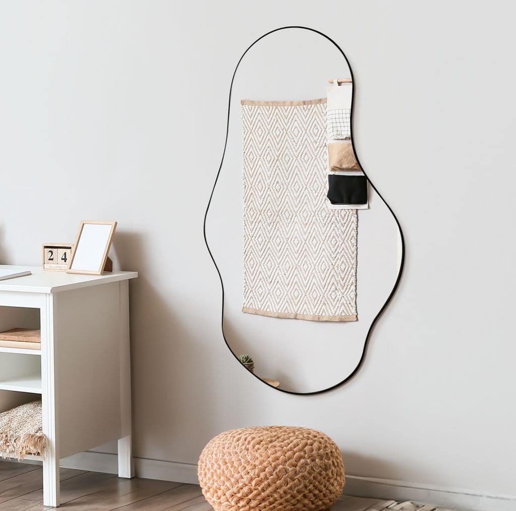 מראה מושלמת בצורה אמורפית עם מסגרת שחורה לתלייה על הקיר