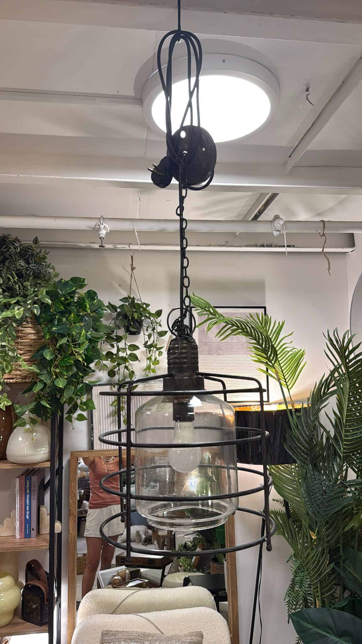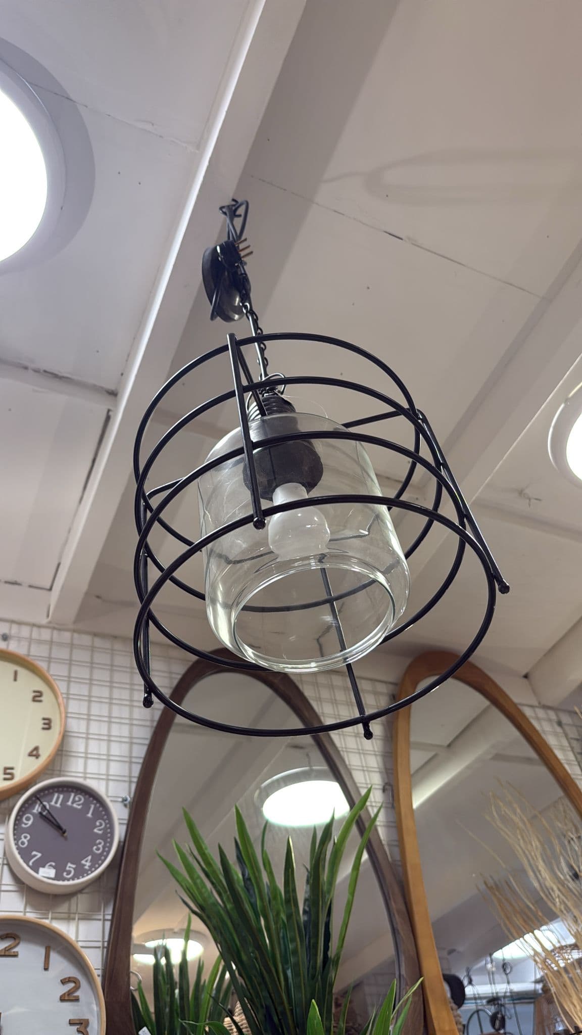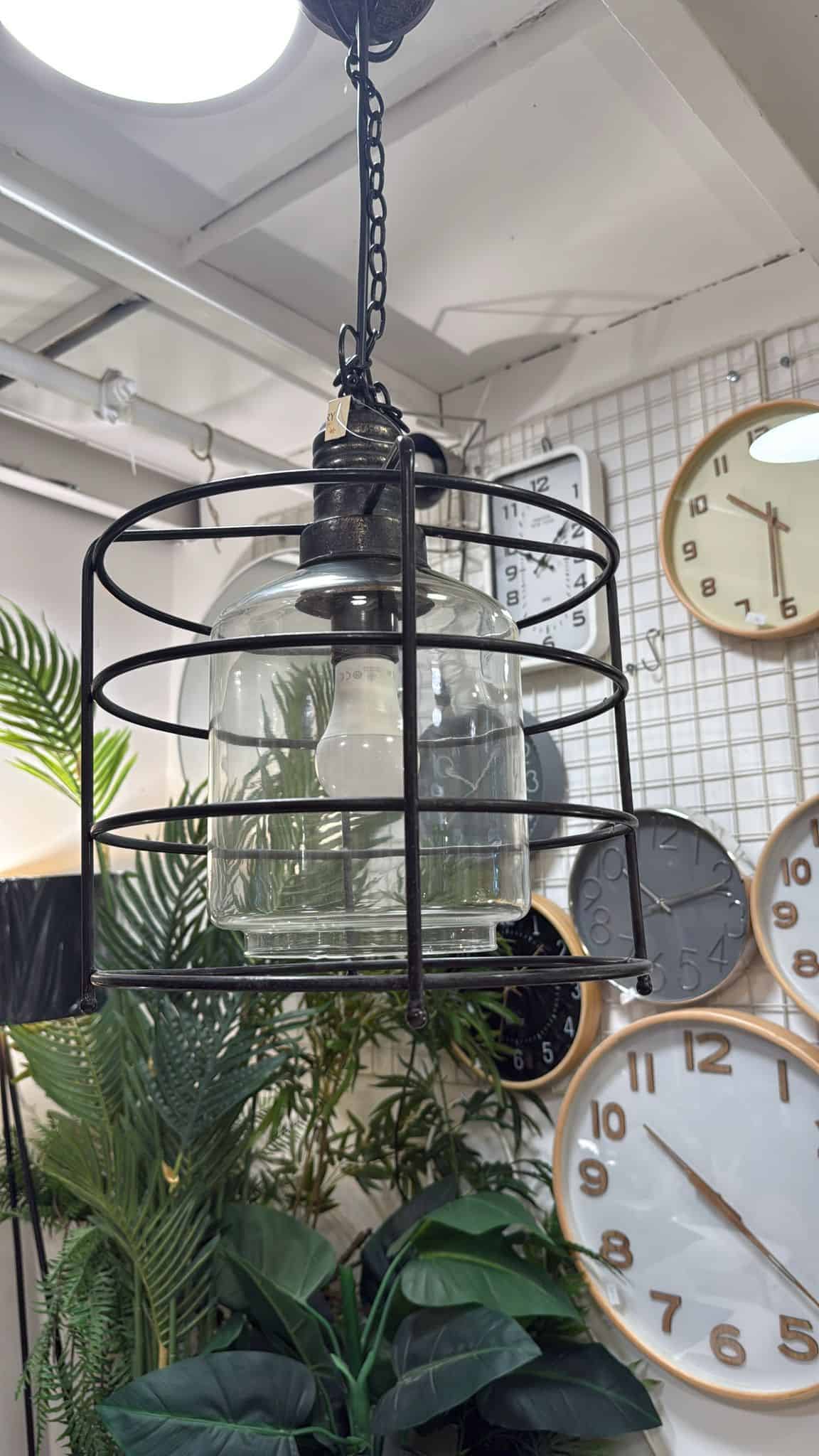מנורת תליה בעיצוב מיוחד, כלי זכוכית עגול ומסביבו מתכת בצבע שחור