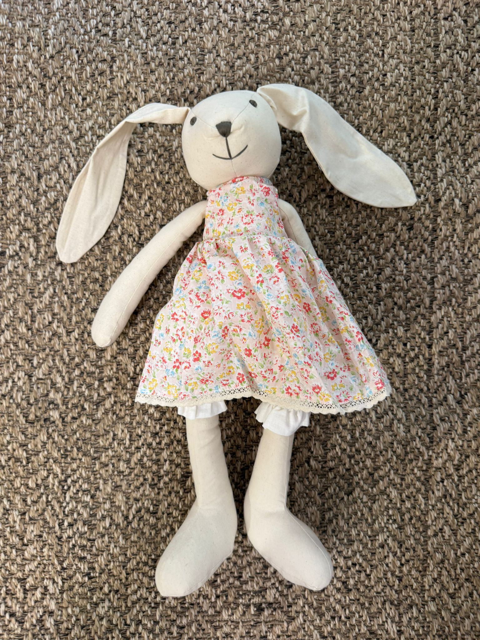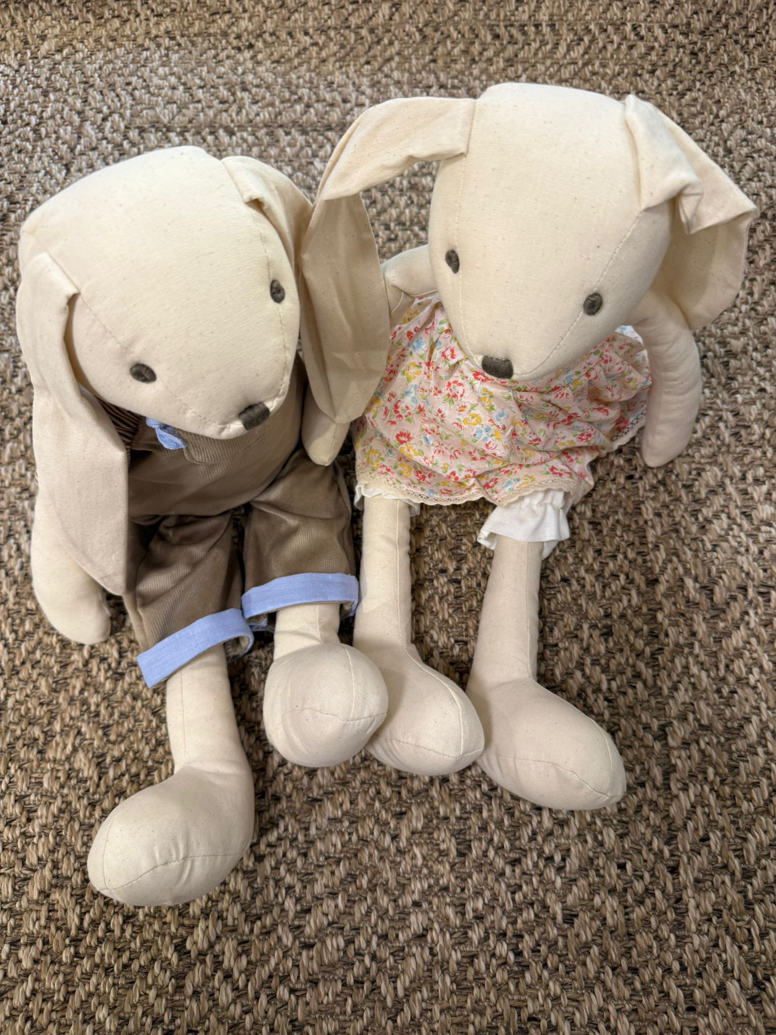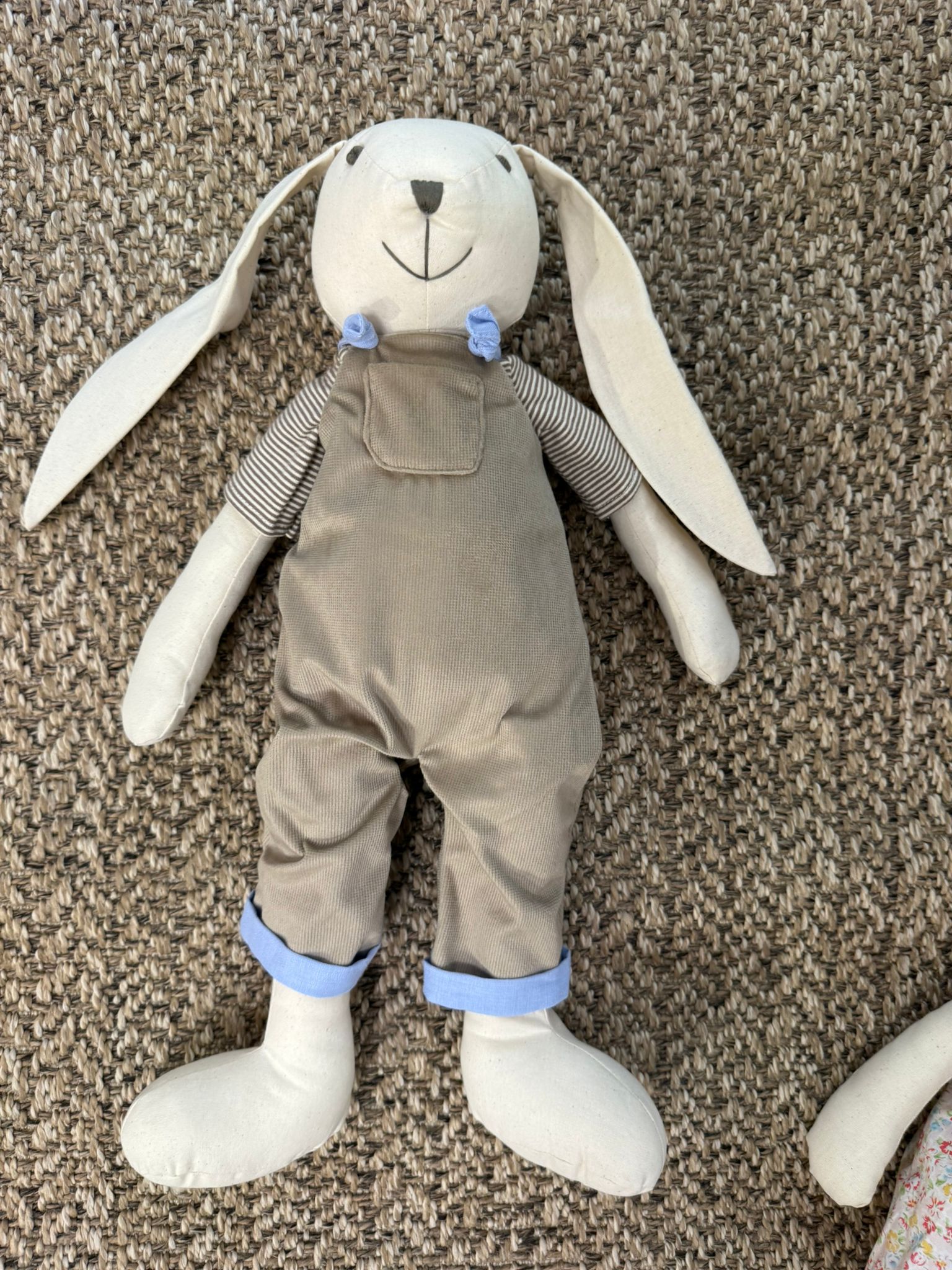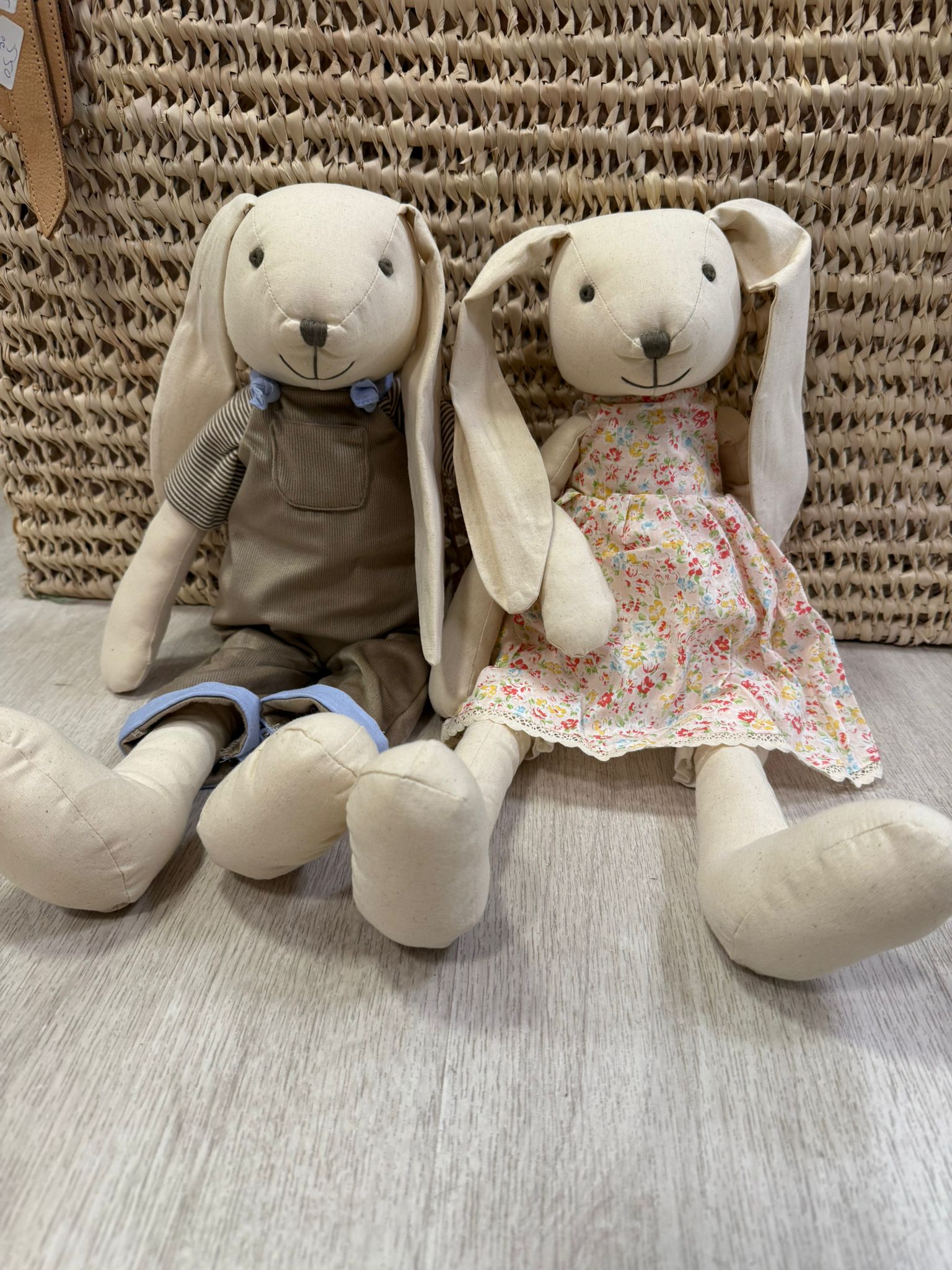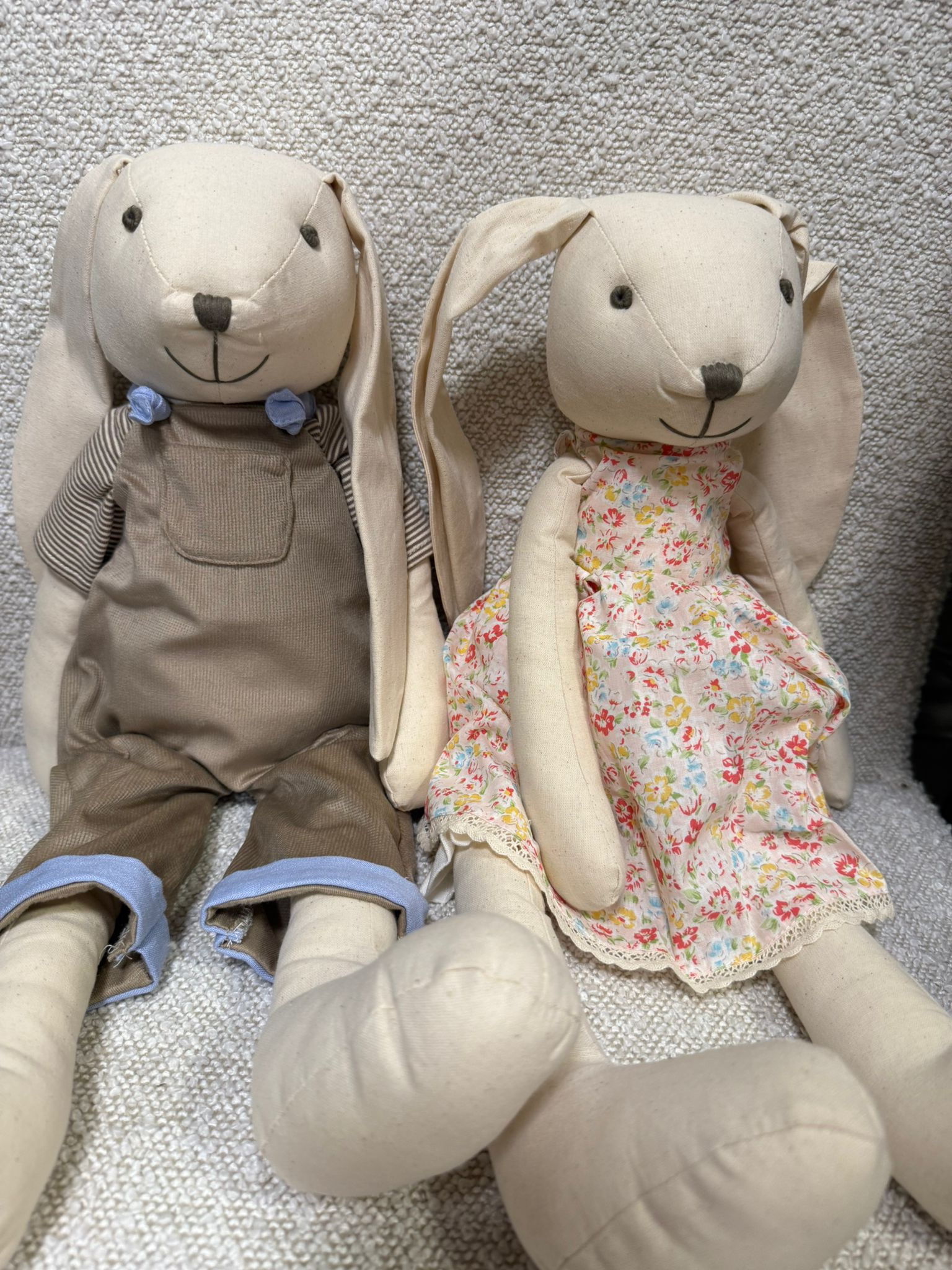 בובות ארנב וארנבת מהממות עשויות בד כותנה, בובה עם שמלה ובובה עם אוברול