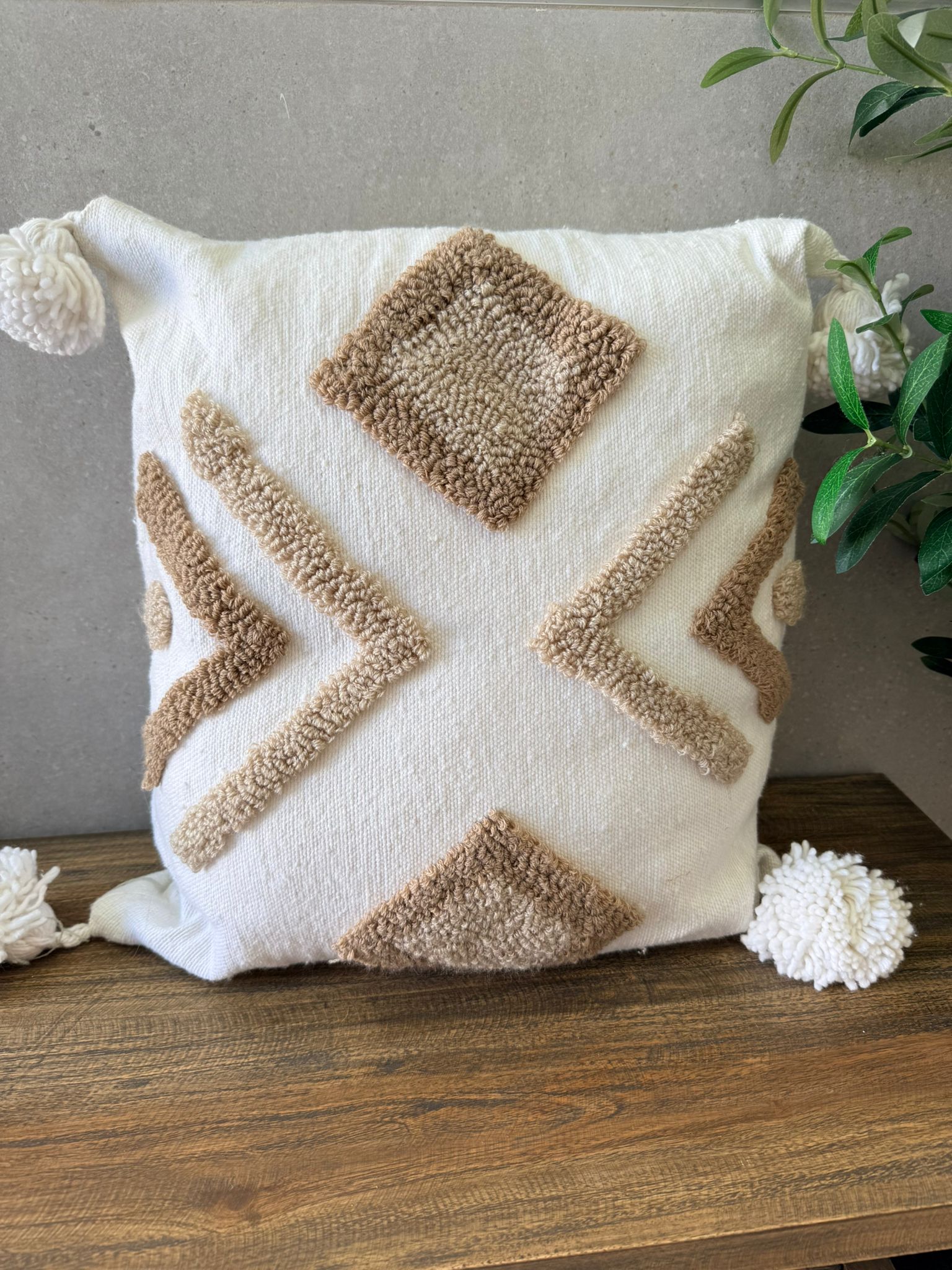 כרית נוי מהממת בגוון טבעי בז', כרית כותנה עם גדילים ודוגמה בצבע חום בז', מתאימה לכל סגנון עיצובי במיוחד סגנון בוהו שיק