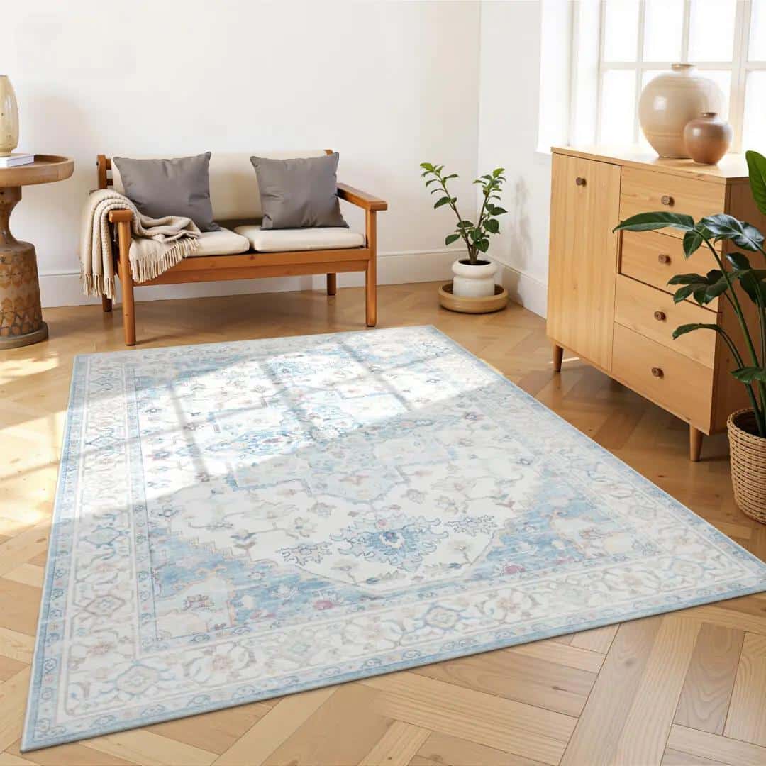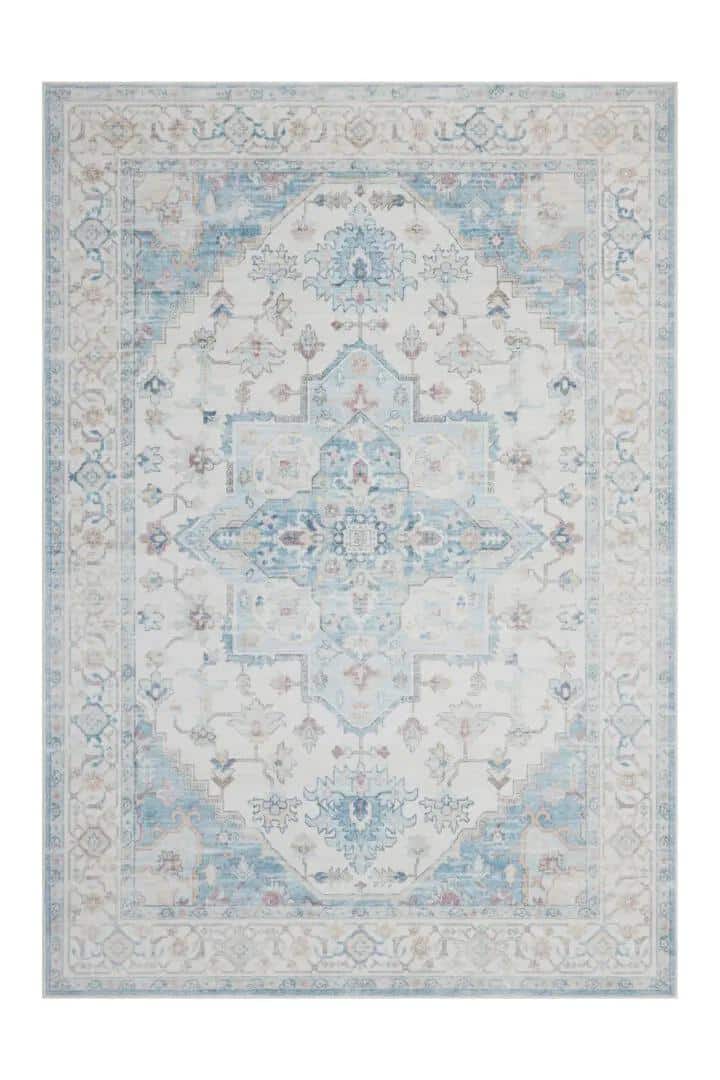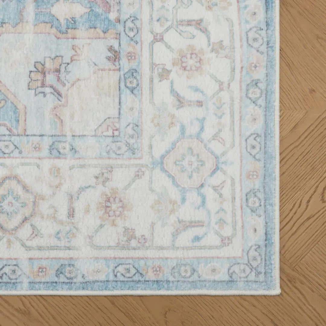 שטיח בהדפסה בפרינט וינטאג' בצבעי תכלת. מושלם לעיצוב הסלון או חדר השינה.