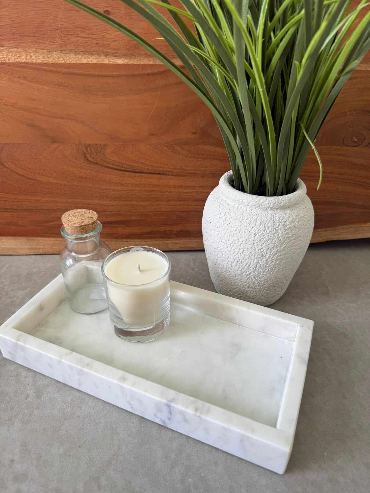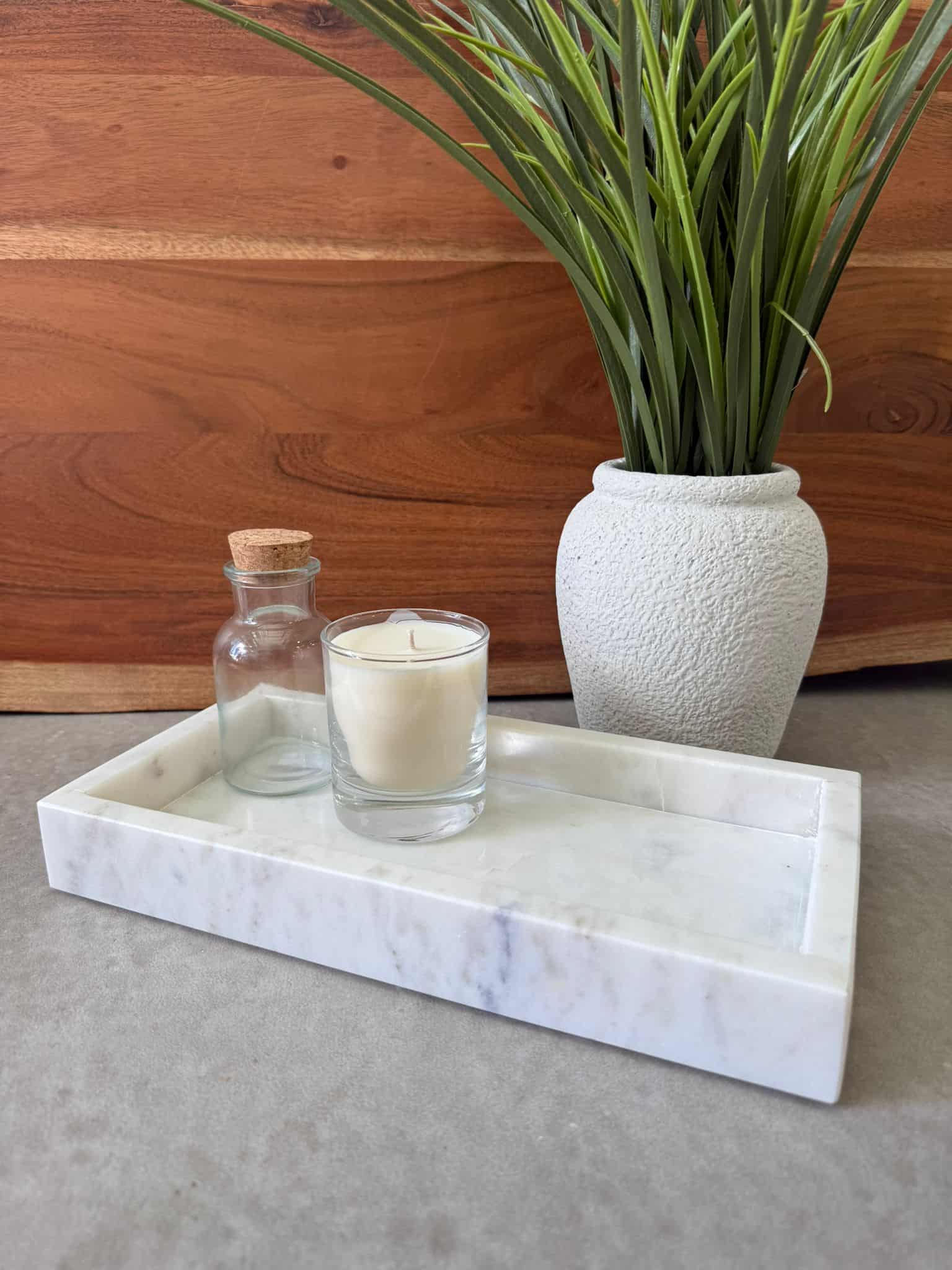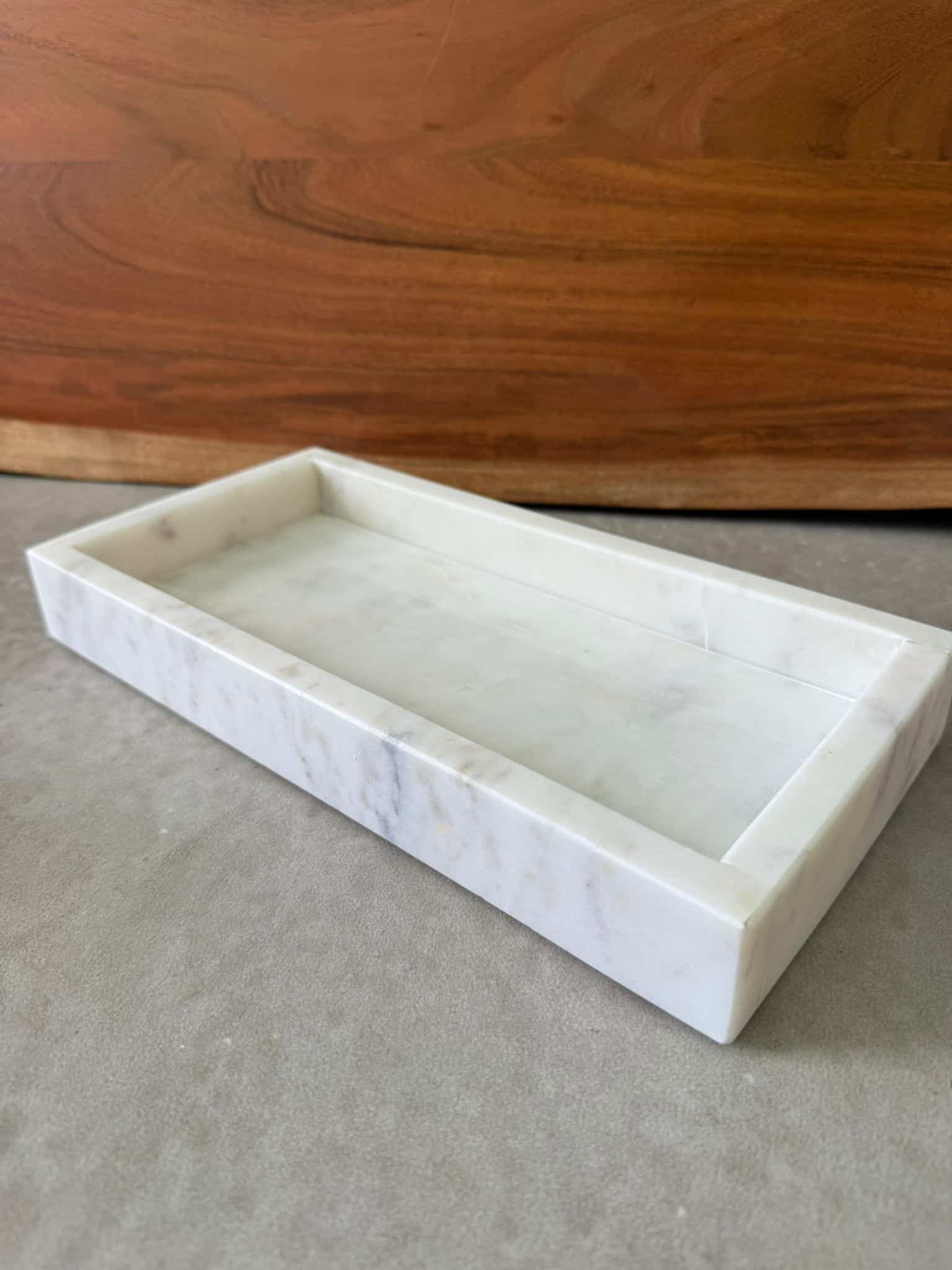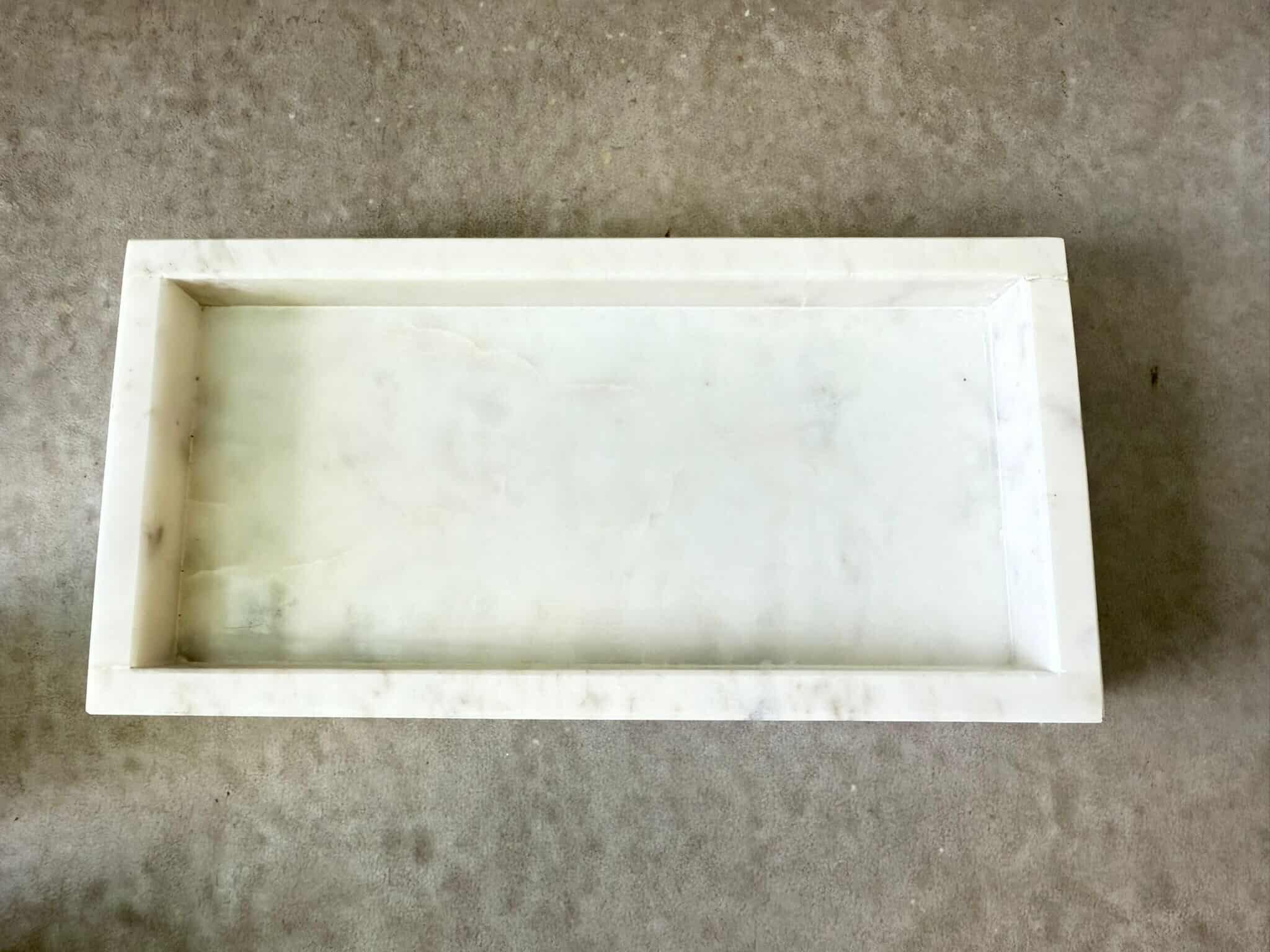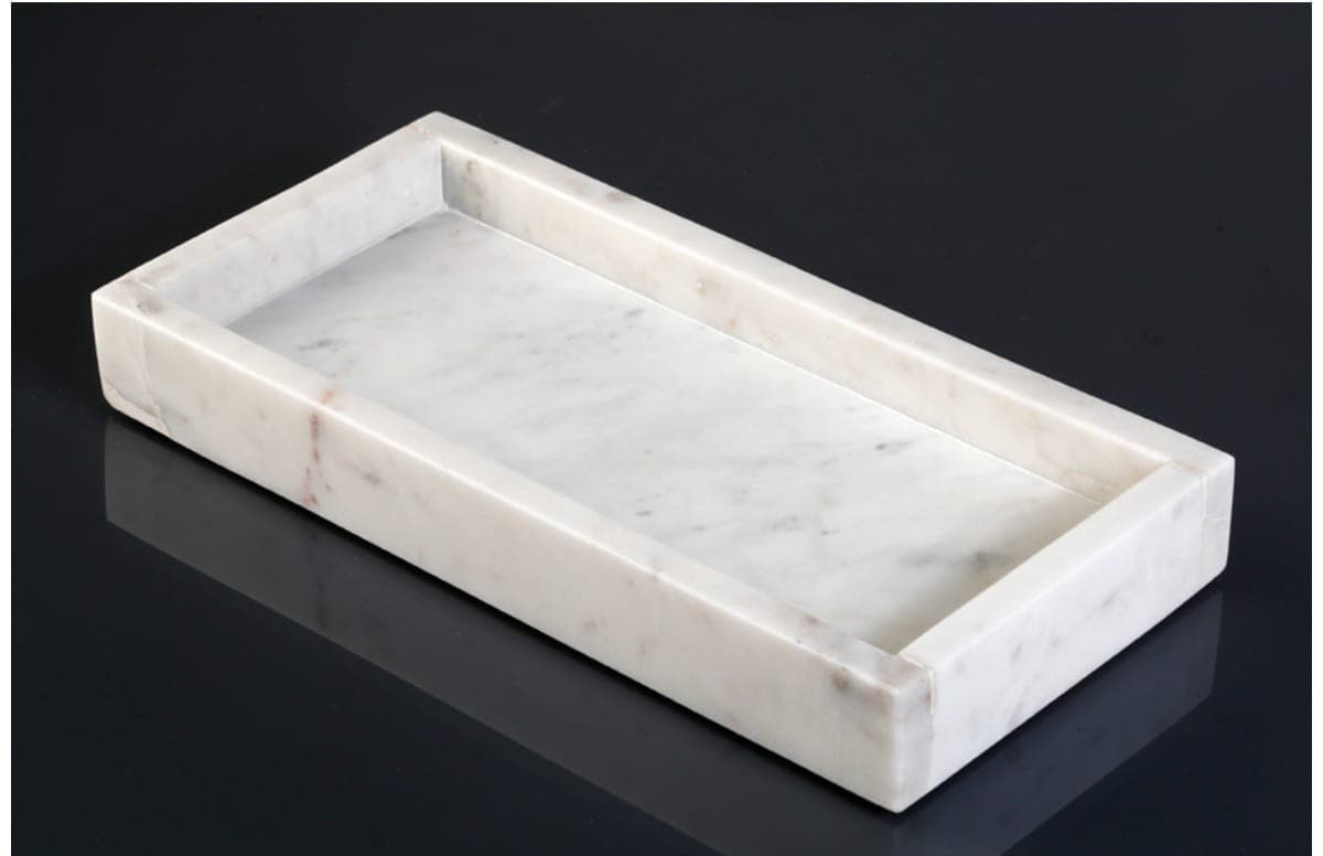 מגש דקורטיבי בצורה מלבנית עשוי משיש בצבע לבן.