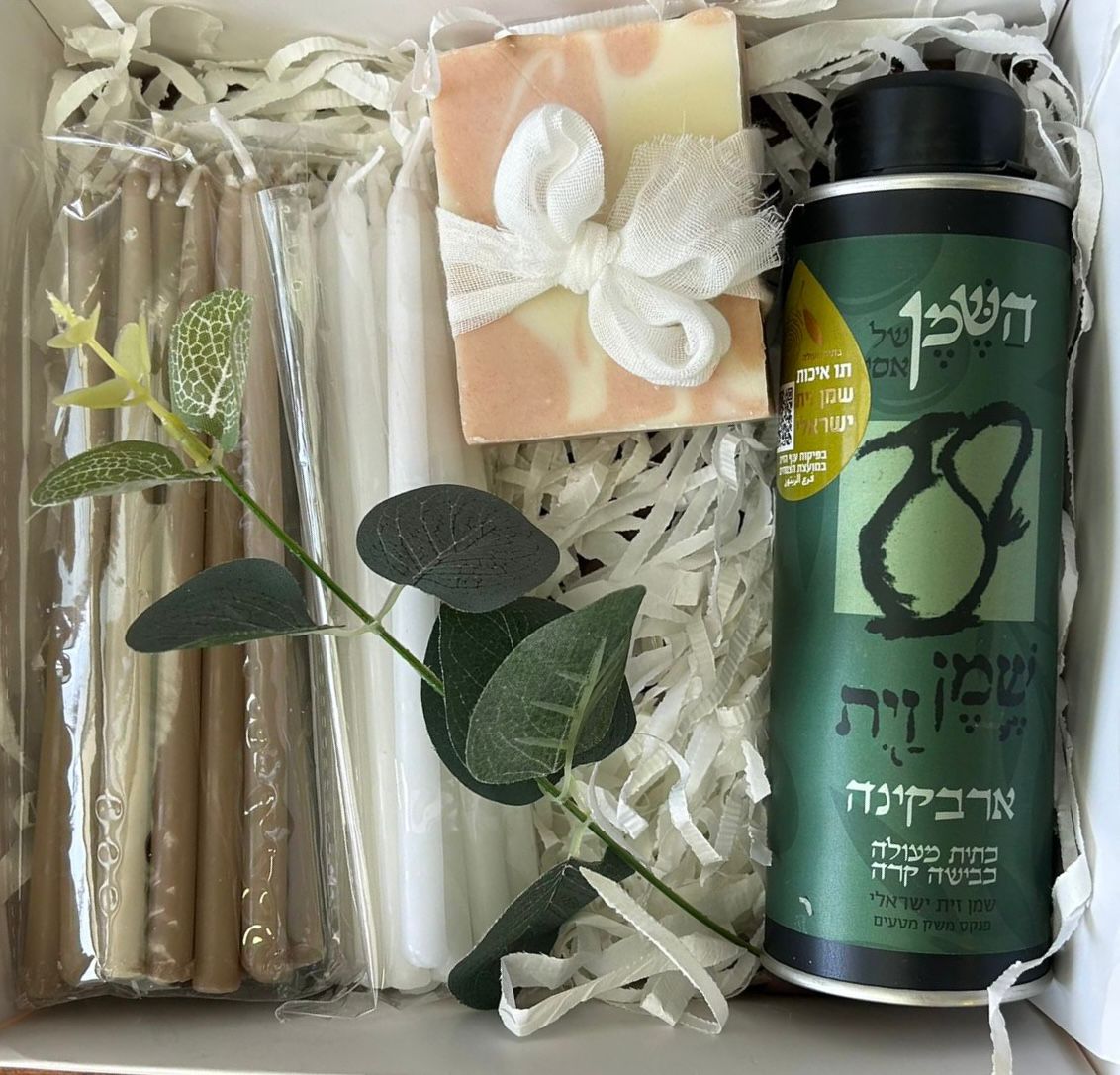 המארז כולל- שמן זית, חבילת נרות חנוכה וסבון טבעי שמן זית