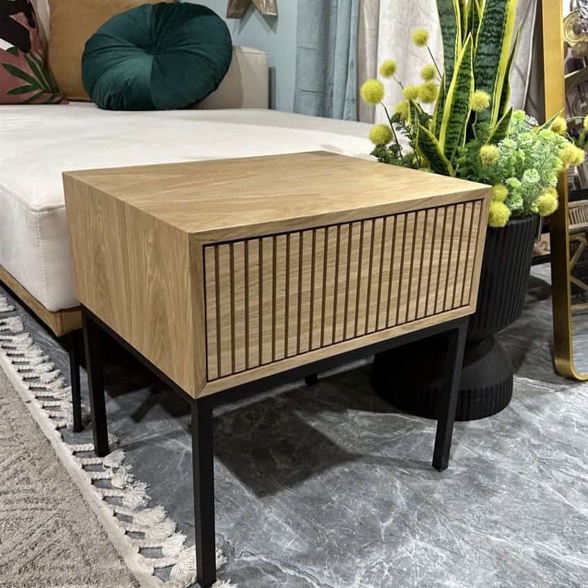 שידת צד מעוצבת עשוי עץ בצבע טבעי בשילוב רגלי מתכת.