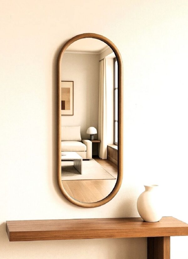מראה מושלמת בצורת קפסולה אליפסה – מלבן מעוגל עם מסגרת עץ טבעי מלא