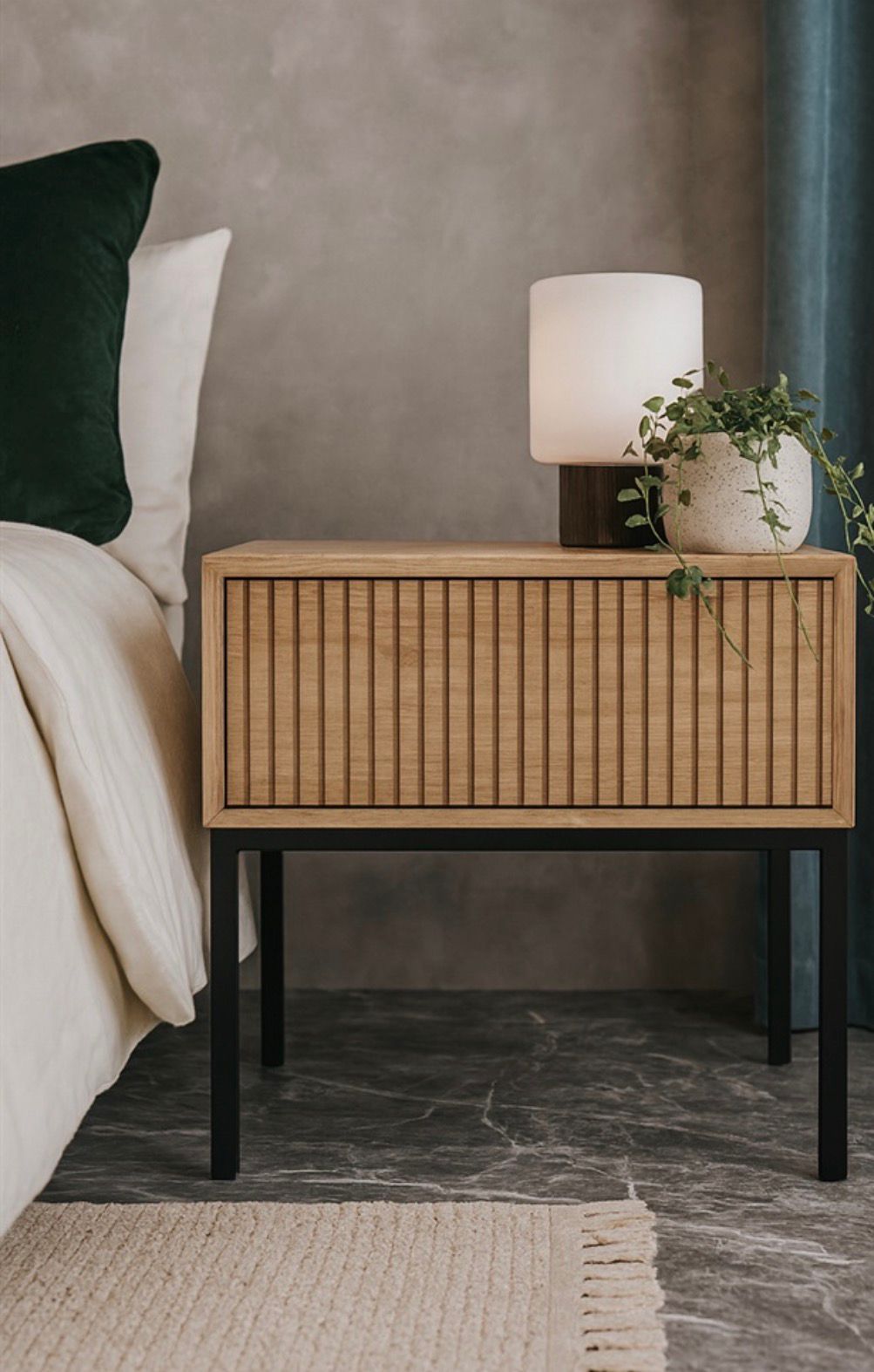 שידה עשויה עץ בצבע טבעי עם רגליים שחורות ממתכת