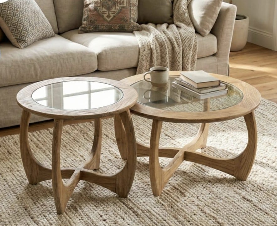 סט זוג שולחנות סלון מהממים, עשויים עץ אלון אסייאתי וזכוכית