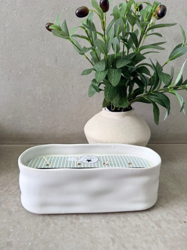 נר מושלם לאווירה בבית יצוק בתוך כלי חרס אובלי מעוצב במראה אלגנטי ומינימליסטי