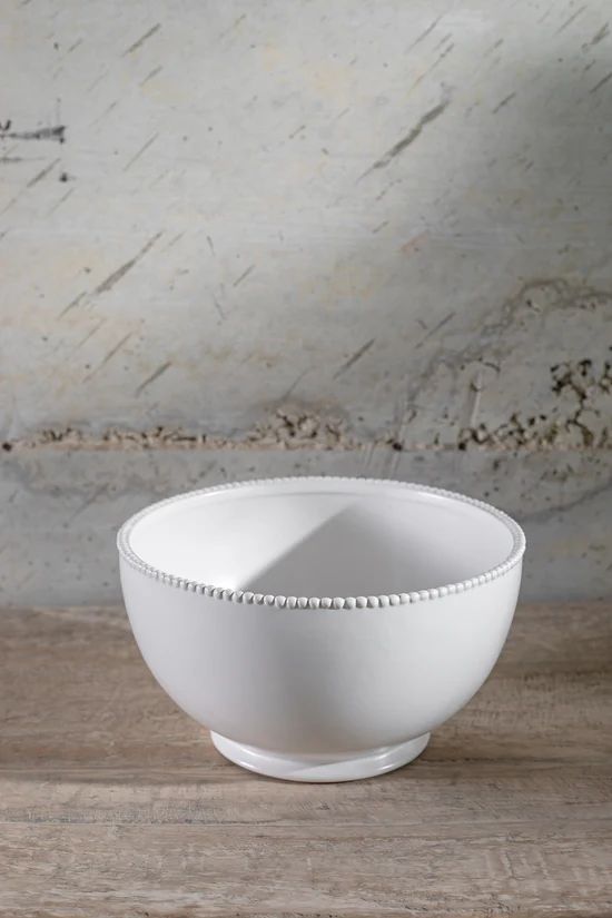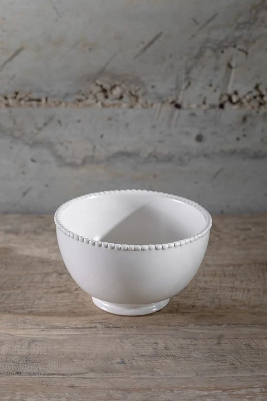 קערת קרמיקה בגימור לבן מט עם שוליים מעוטרים פונפונים קרמיים קטנים ועדינים