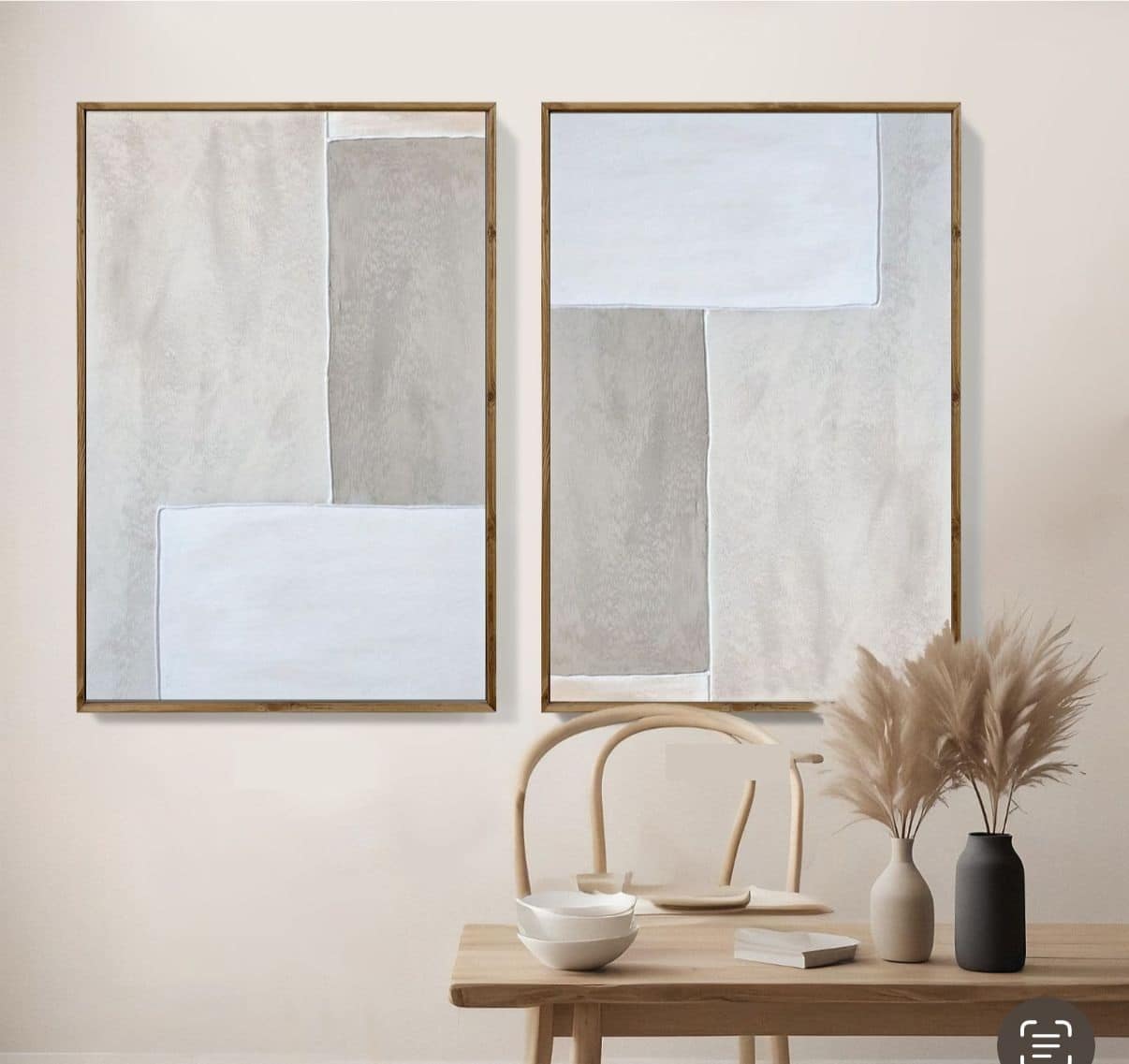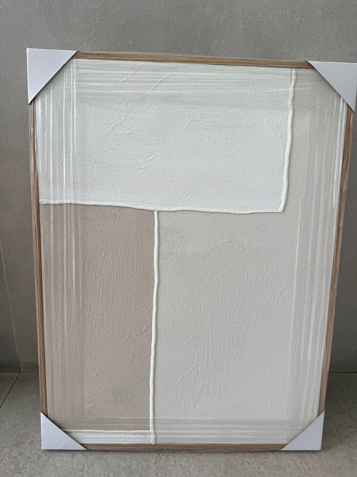 תמונת קנבס מהממת עם צורות מלבניות בגדלים שונים בגוונים לבן, שמנת ובז', עם מסגרת עץ