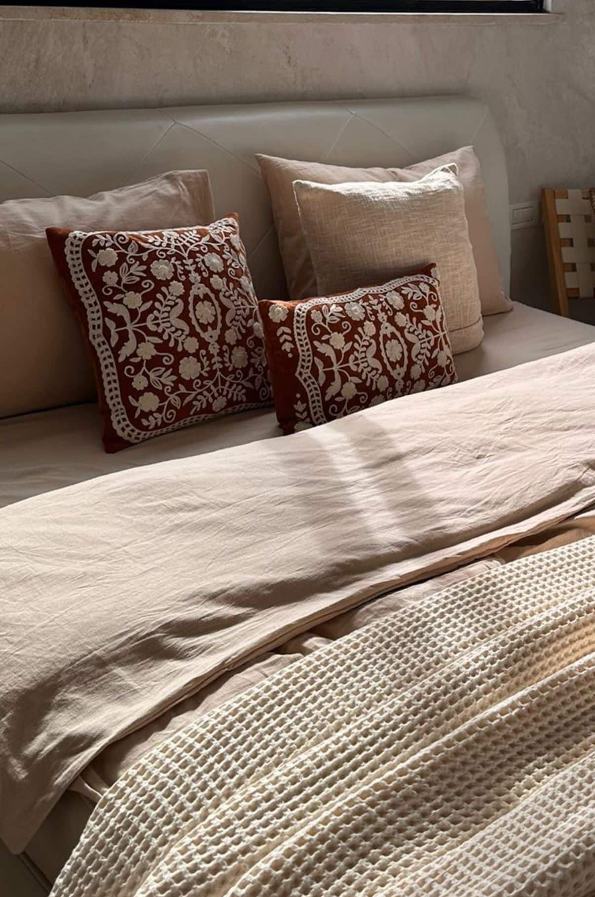 Blush pink linen bedding with two pillows and wrinkled sheets on a cozy bed in a minimalist bedroom