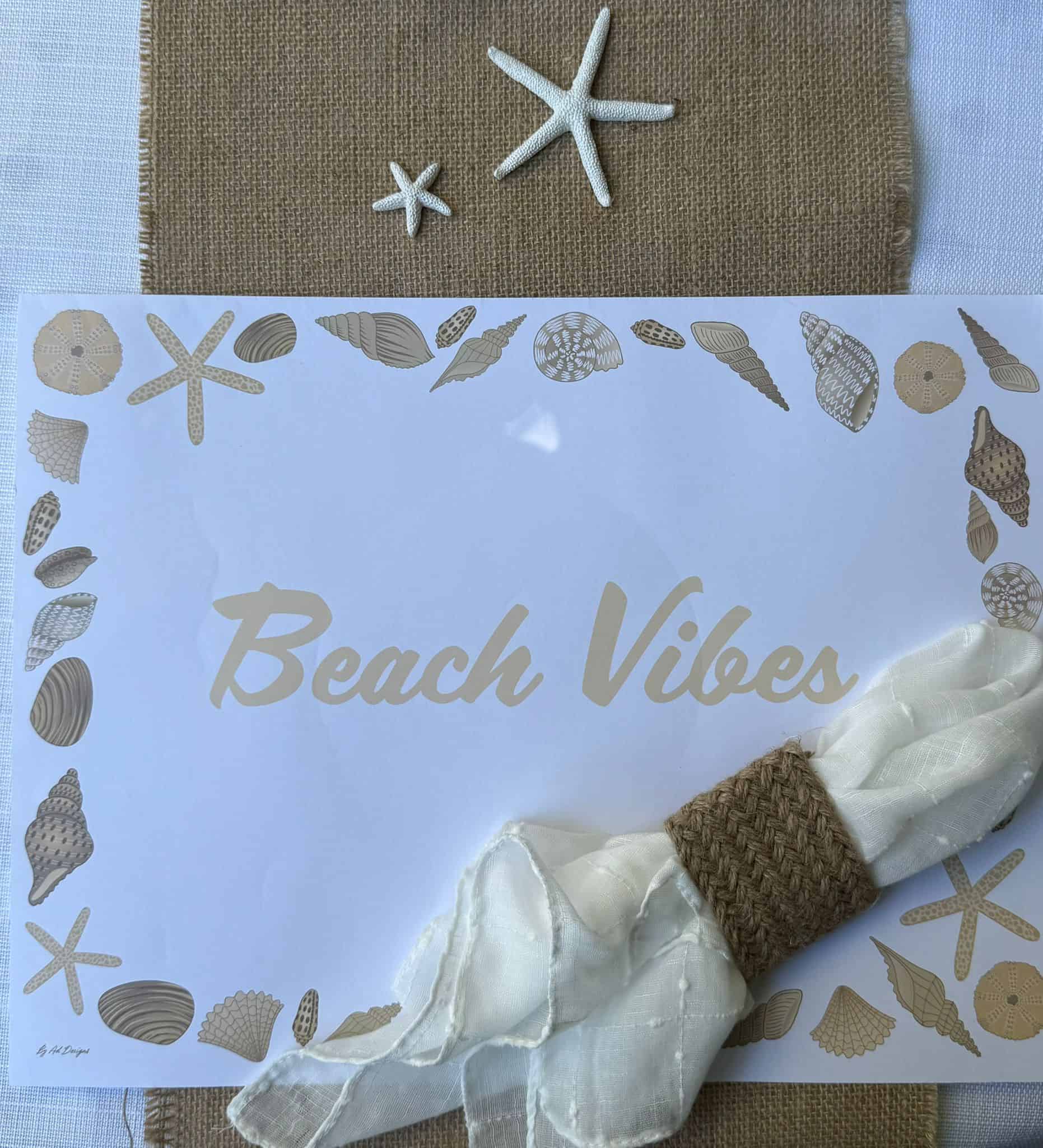 חבילת פלייסמנטים מנייר איכותי לשימוש חד פעמי עם הדפס צדפים וכיתוב BEACH VIBES