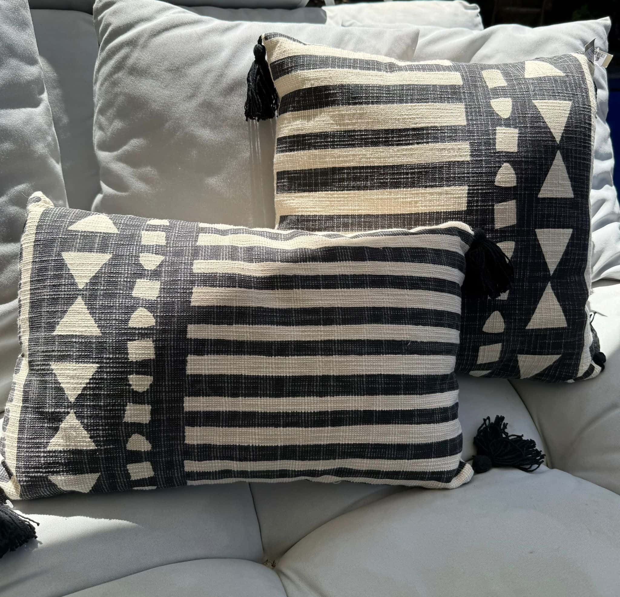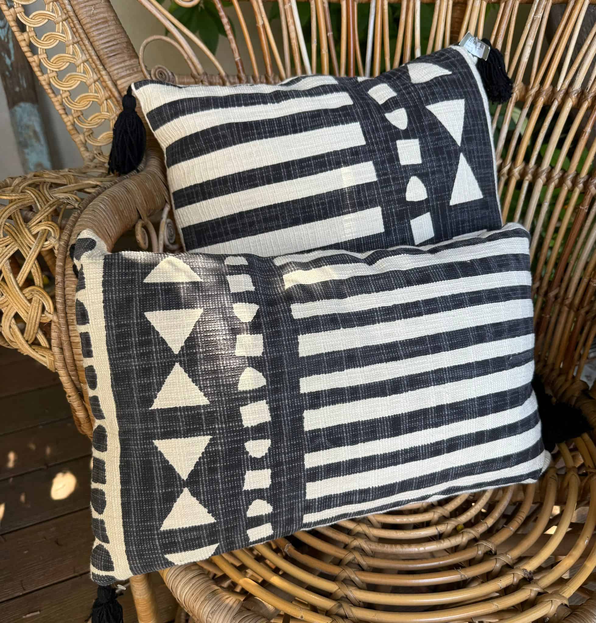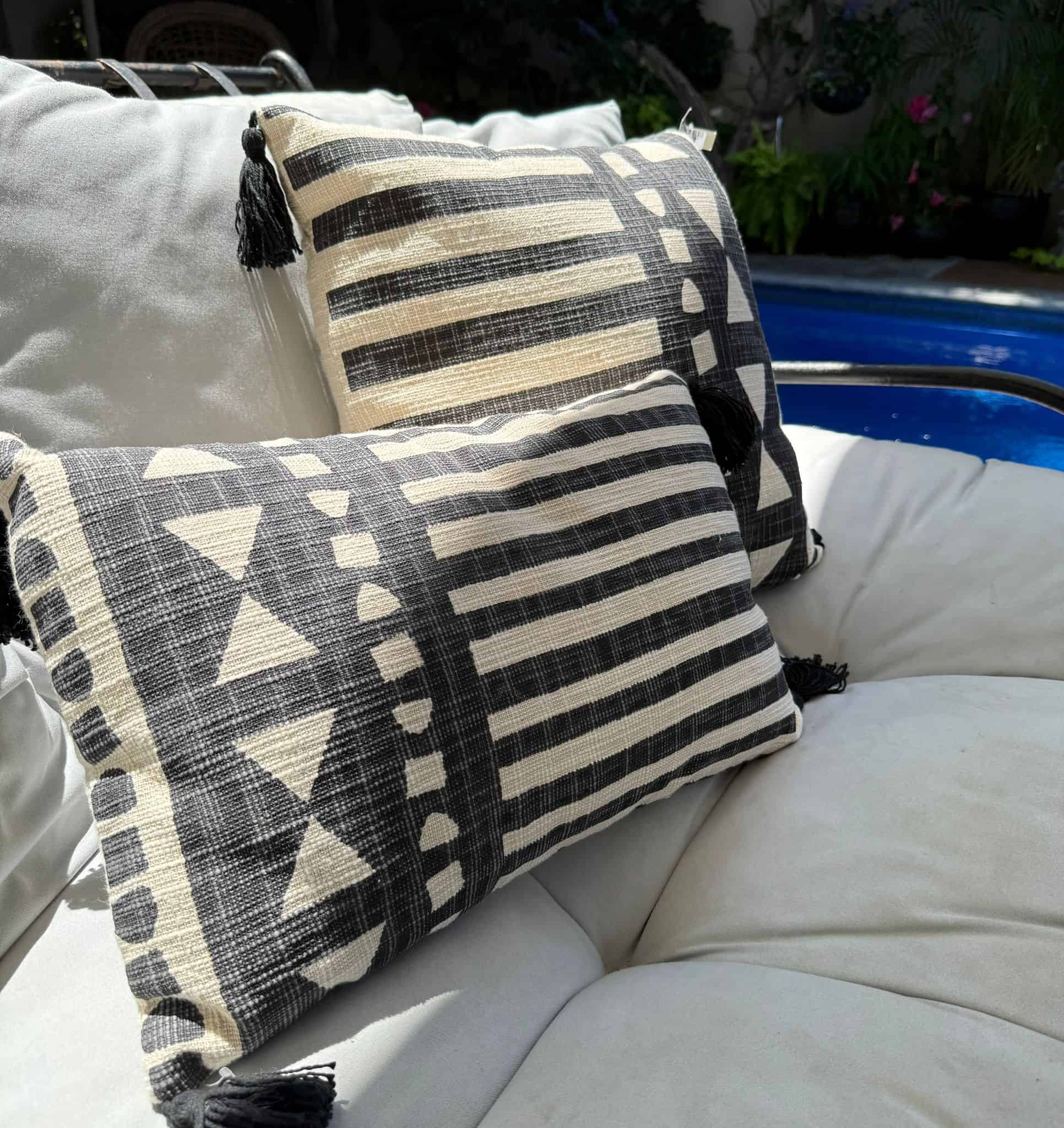 כרית מרובעת או מלבנית עם גדילים בצבע שחור בפינות , גוון טבעי עם הדפס שחורה