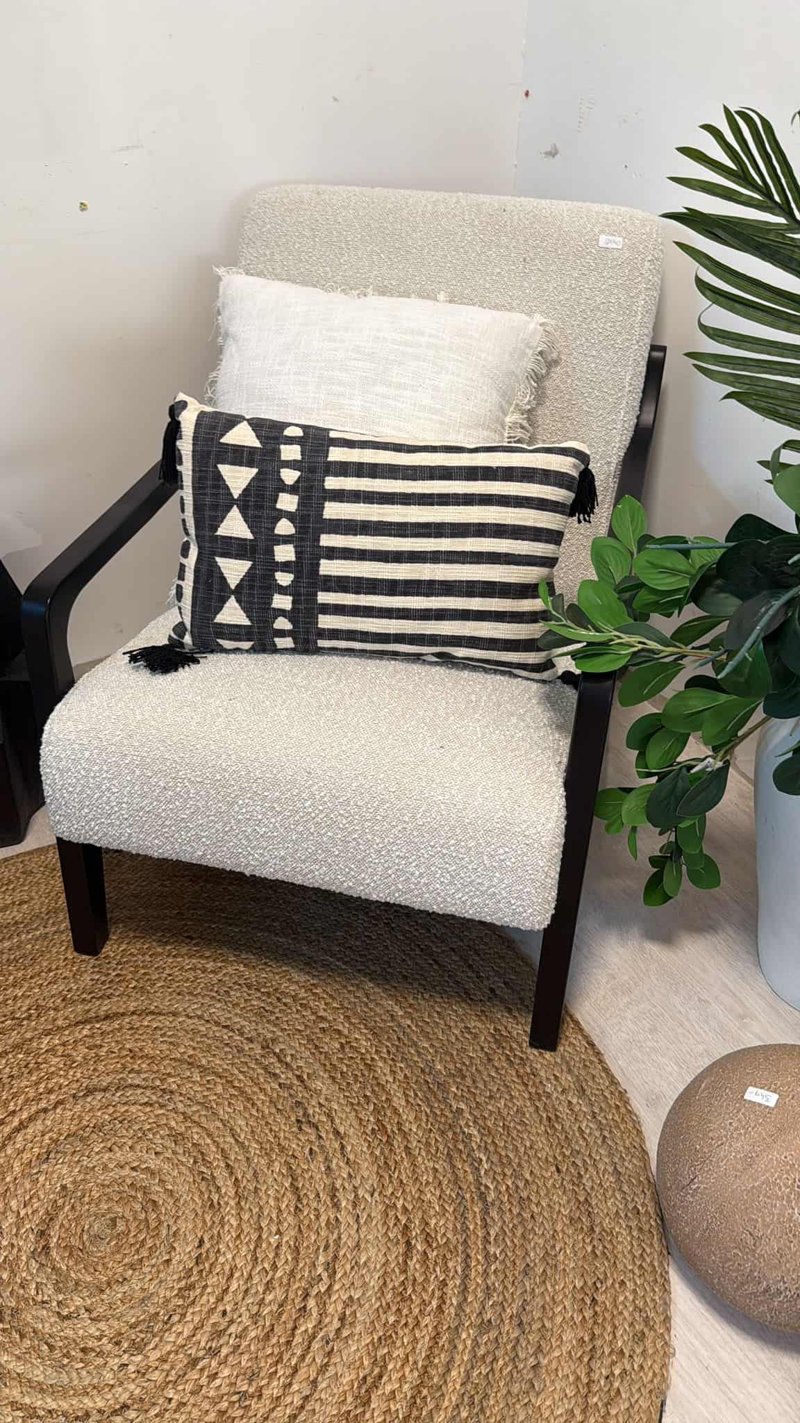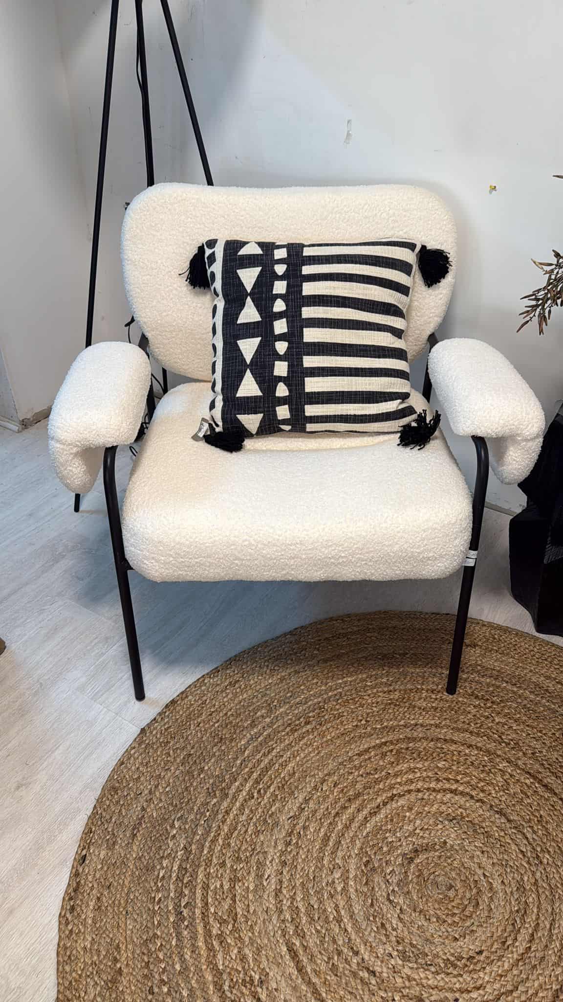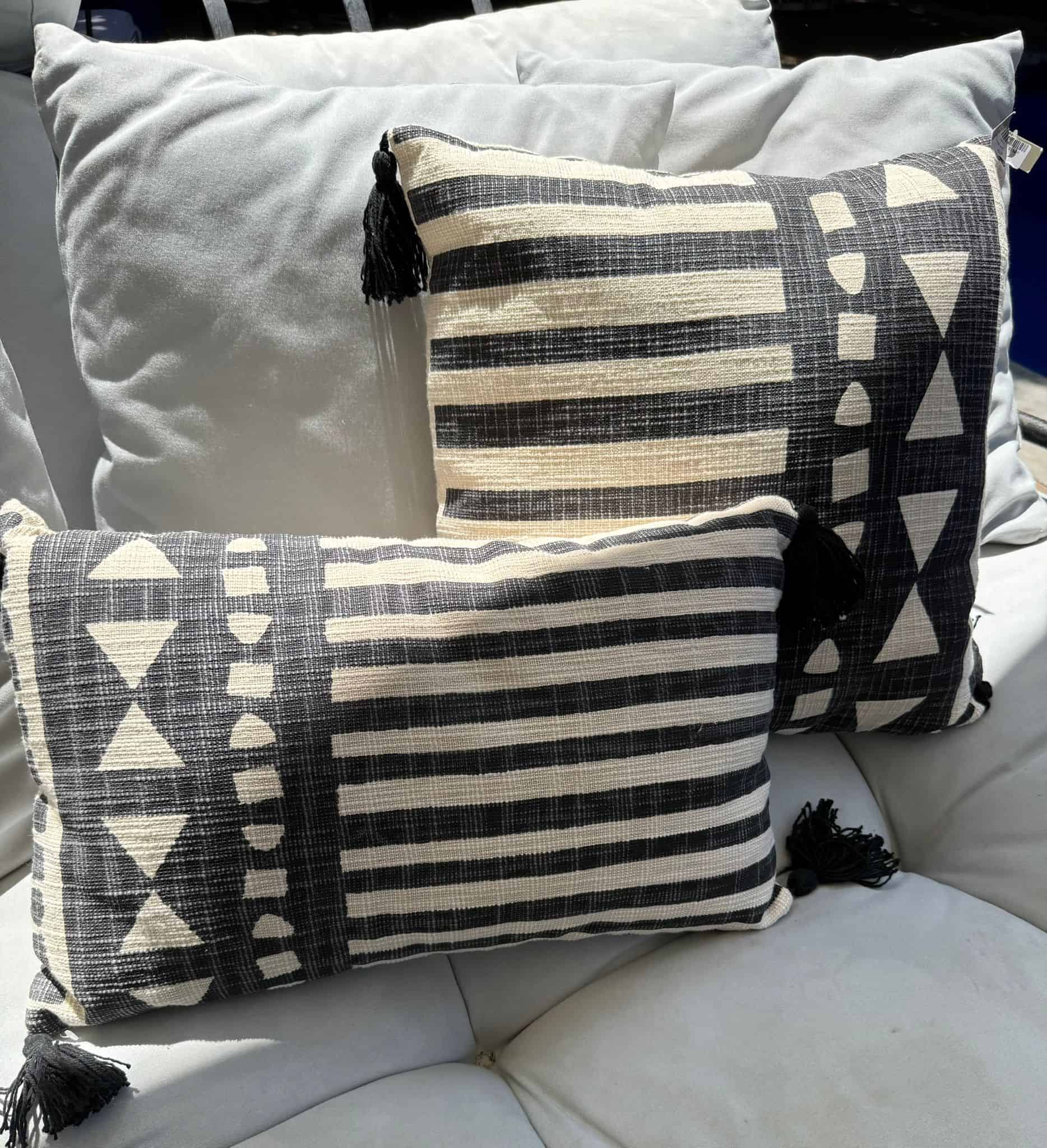 כרית מרובעת או מלבנית עם גדילים בצבע שחור בפינות , גוון טבעי עם הדפס שחורה