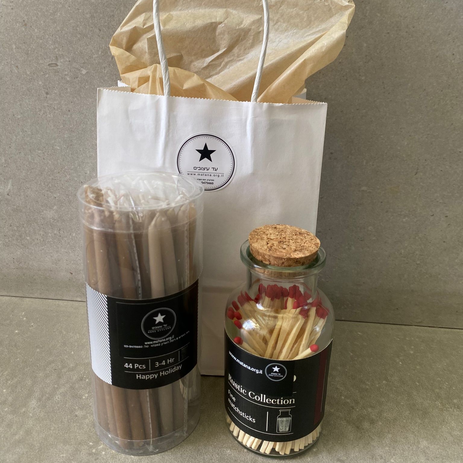 המארז כולל- חבילת 45 נרות לבנים, בקבוק גפרורים מזכוכית בשילוב שעם.