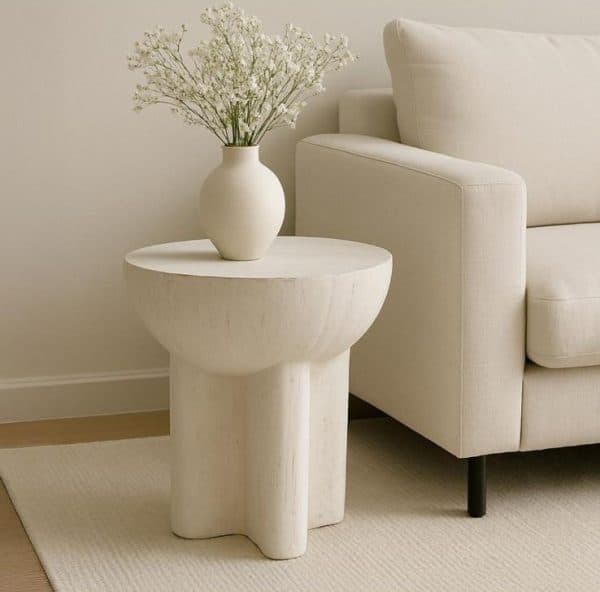 שולחן צד לבן עשוי אבן דמוי טרוונטין במראה נקי מנמליסטי
