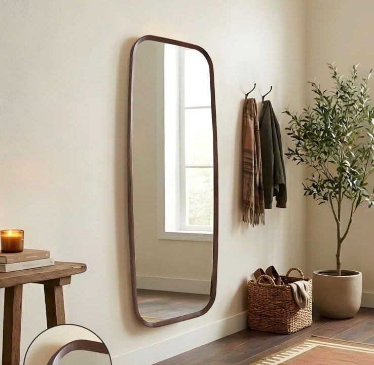מראת גוף מושלמת בצורה מלבנית עם פינות מעוגלוצת, מסגרת מעץ אגוז