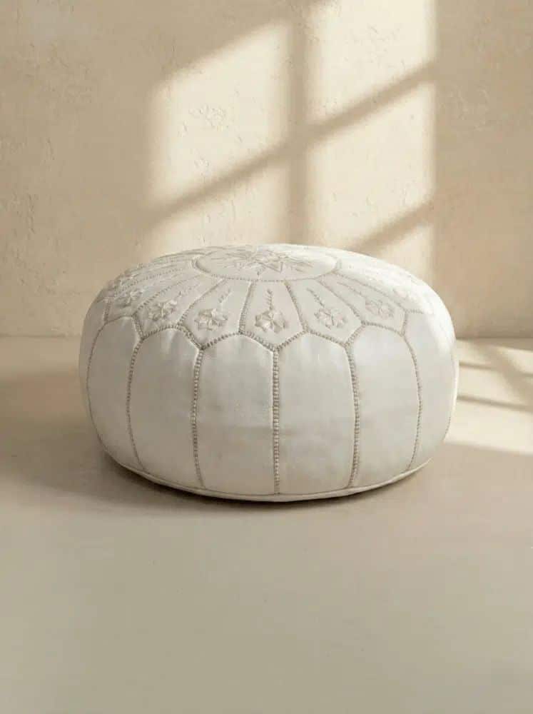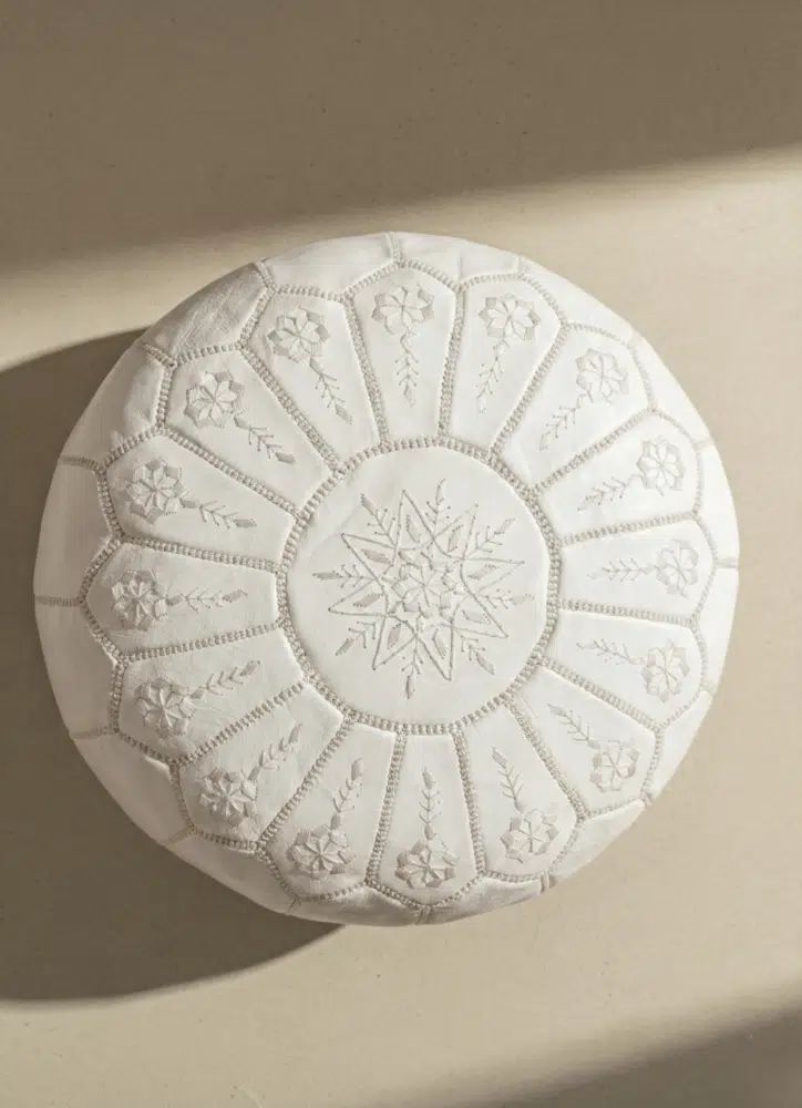 פוף עור מרוקאי בצבע לבן עם עיטרוים בצבע לבן עשוי בעבודת יד