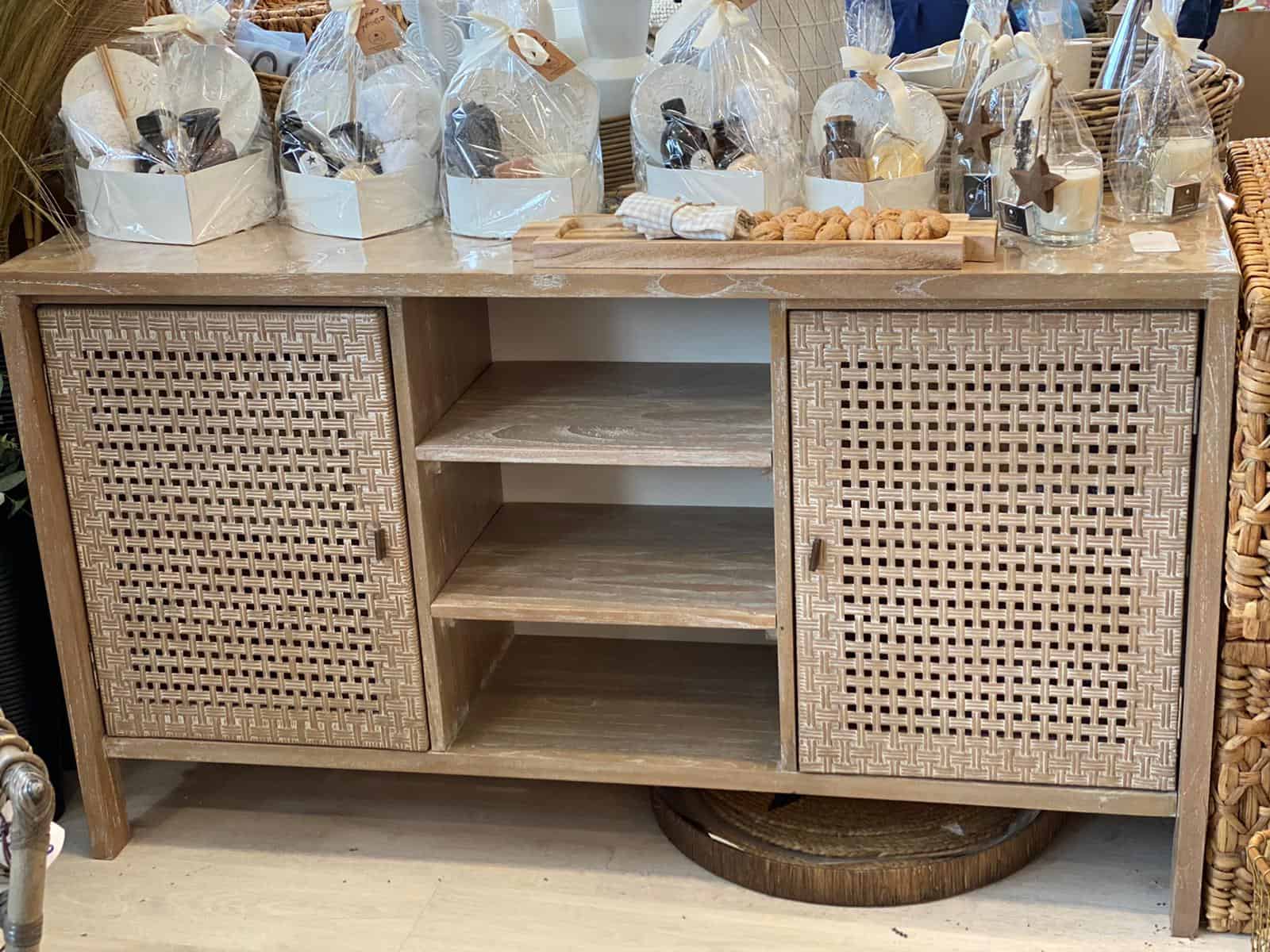 קומודה ייחודית ומעוצבת מעץ עם ראטן, עם מקום אחסון גדול